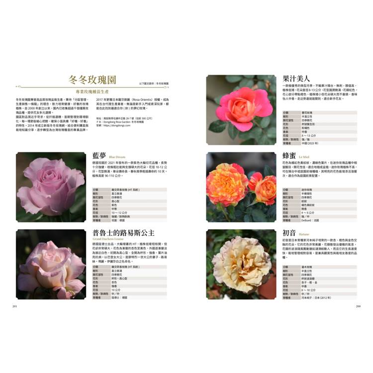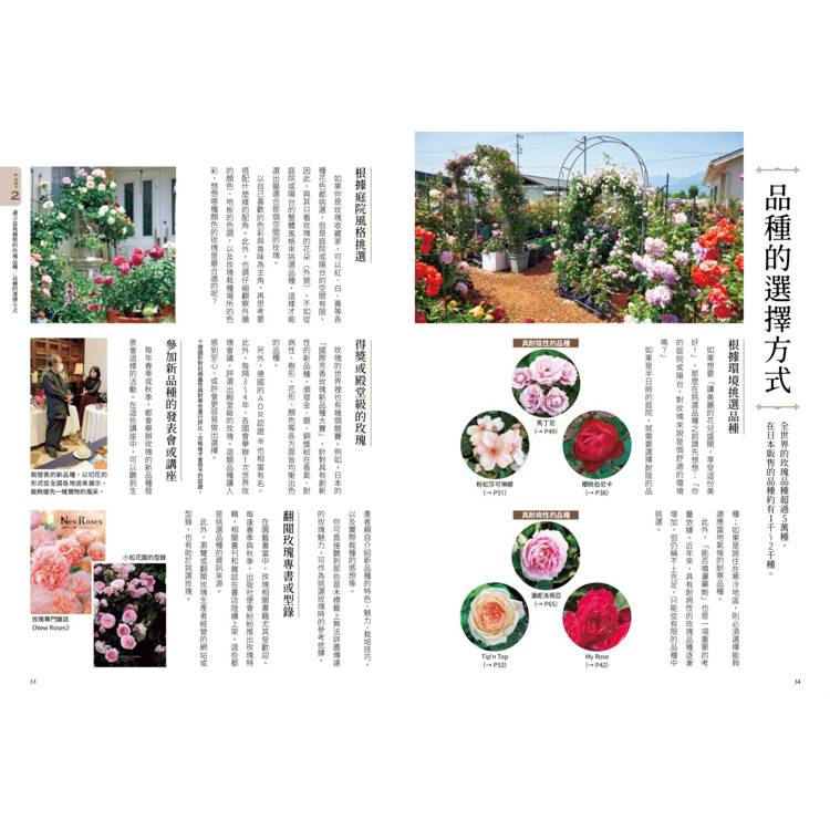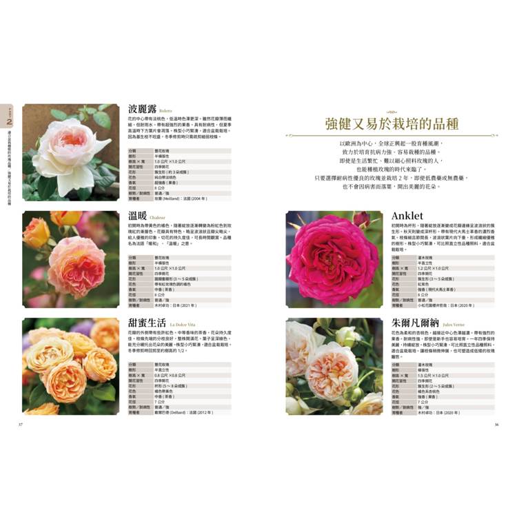 ② 邀請國內知名玫瑰業者——「美加美玫瑰園」、「芳香玫瑰園」、「冬冬玫瑰園」,共同推薦與介紹70種台灣適種的健壯豐花品種,讀者可安心入手栽培。