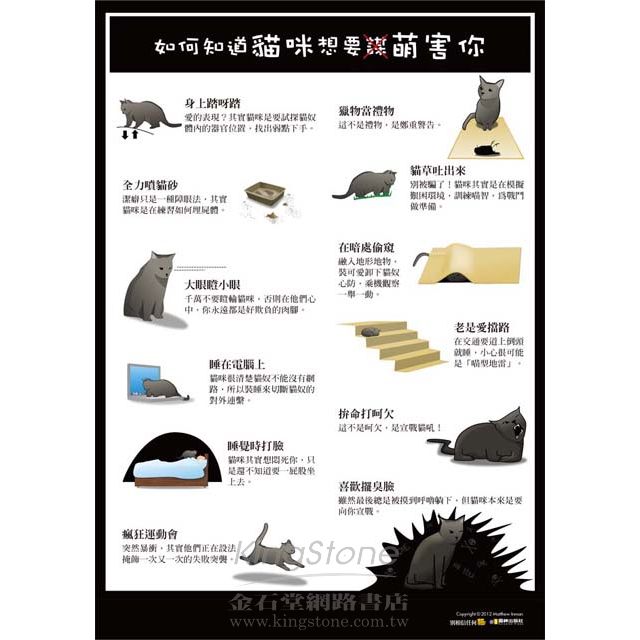 當全球的貓奴都還自以為與貓咪的關係獨一無二時,作者馬修‧英曼勇敢揭穿貓咪的真面目,用生命寫下「如何知道貓咪想要萌害你?」果然立刻引起高達五百萬人的迴響,無一不感謝他的救命之恩,還有──這本可以讓人從頭狂笑不已,到了最後一頁心情竟然會有點酸酸的書。