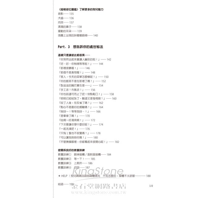 本書是以狗狗回答人類疑問的對話形式,從動物行為學和動物心理學的觀點解釋牠們的習慣和習性。首先,從「你到底在想些什麼呢?」這個疑問開始,展開和狗狗之間的親密對話。有句非常有道理的名言道:「不是狗狗不乖,只是主人不懂」。要先瞭解狗寶貝的行為意義,主人才能正確的把想表達的事情傳達給狗狗知道。加深了彼此的信賴感,從此便再無不乖的狗狗了。
