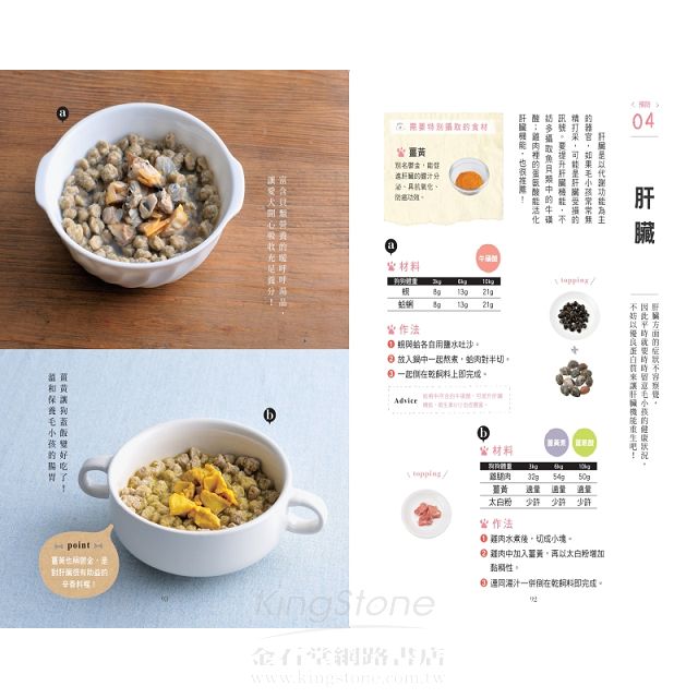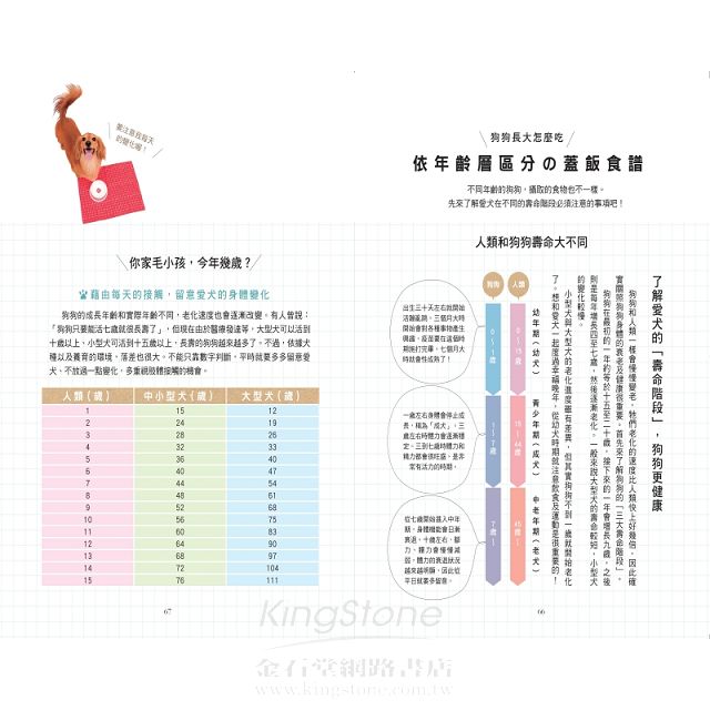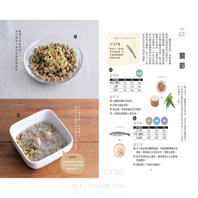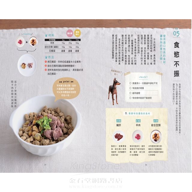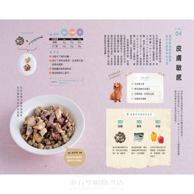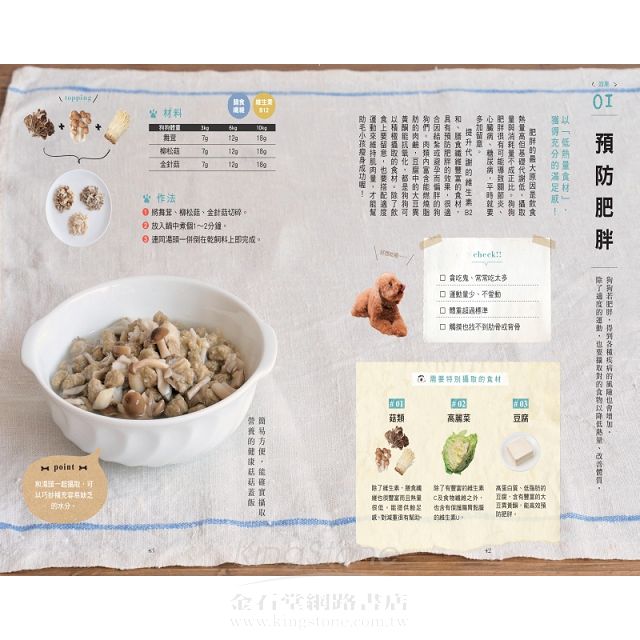 小林醫師針對狗狗常見的「肥胖」、「免疫力低下」、「皮膚搔癢」等7大問題,以及心臟病、腎臟病、關節炎等5大常見疾病設計不同的蓋飯食譜,不但能讓毛小孩吃得開心,還能改善身體機能、預防疾病!