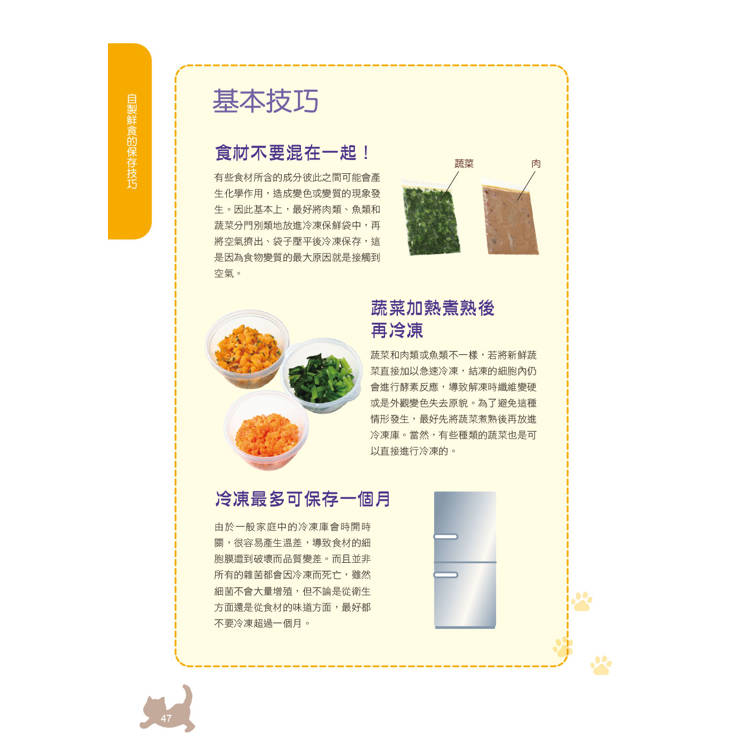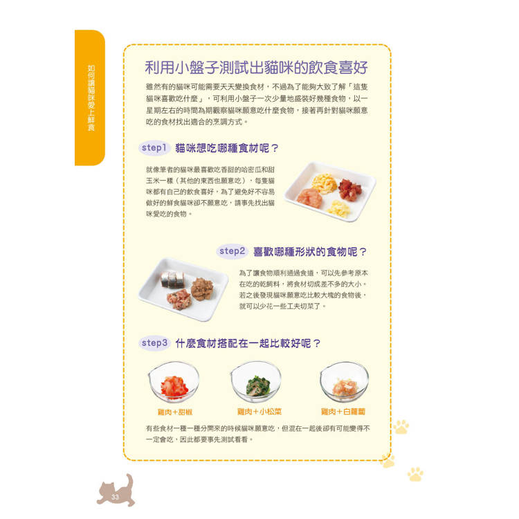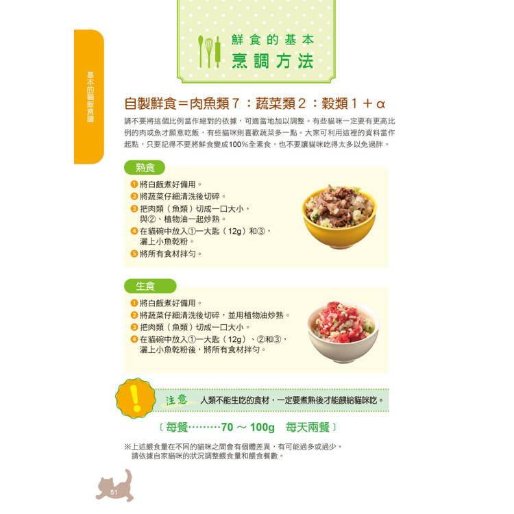 ‧自製鮮食與食材的選擇與保存技巧:從食材挑選、基本切法到烹調方式與保存技巧,讓你的貓咪一步一步愛上鮮食。