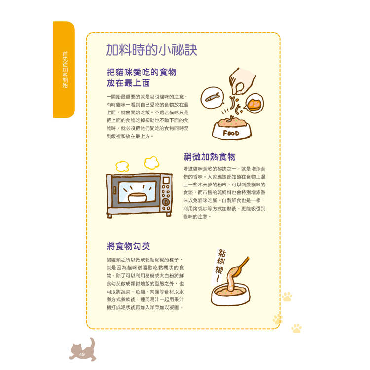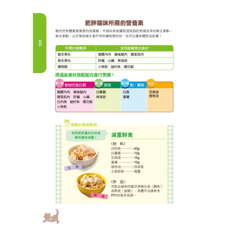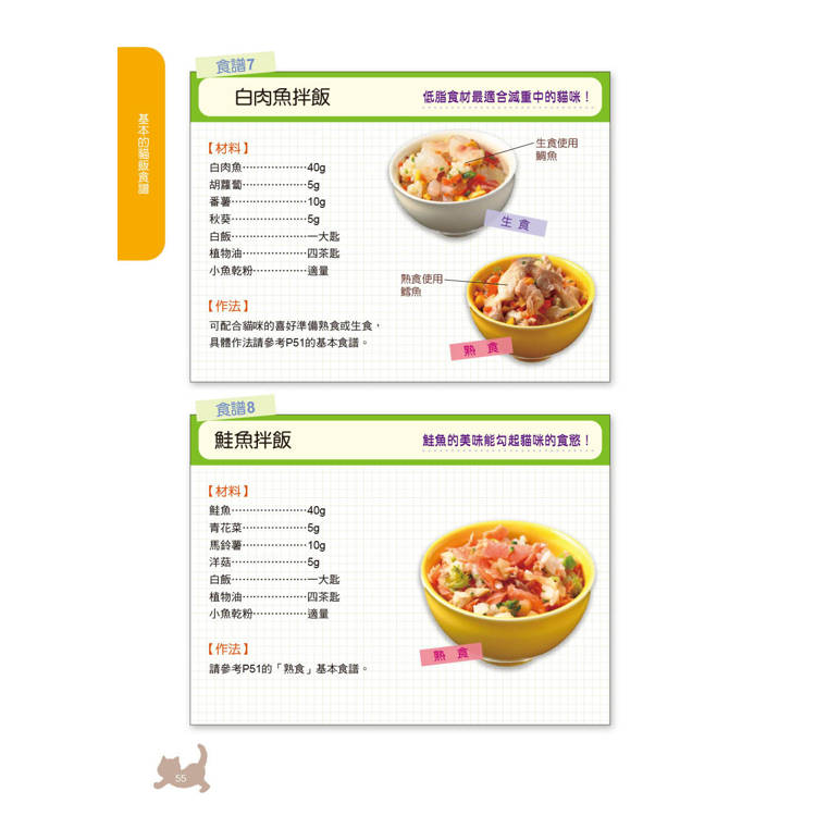 ◎兼顧安全與愛的料理方式:包含熟食與生食的烹調法、保存要點與比例調整,幫助你在忙碌生活中也能輕鬆準備健康貓飯。