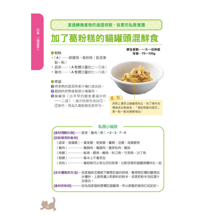 ‧從乾飼料轉換為自製鮮食的完整教學:包含貓咪接受新食材的心理分析、飼料與鮮食的營養對照、實際轉換步驟與常見疑問。