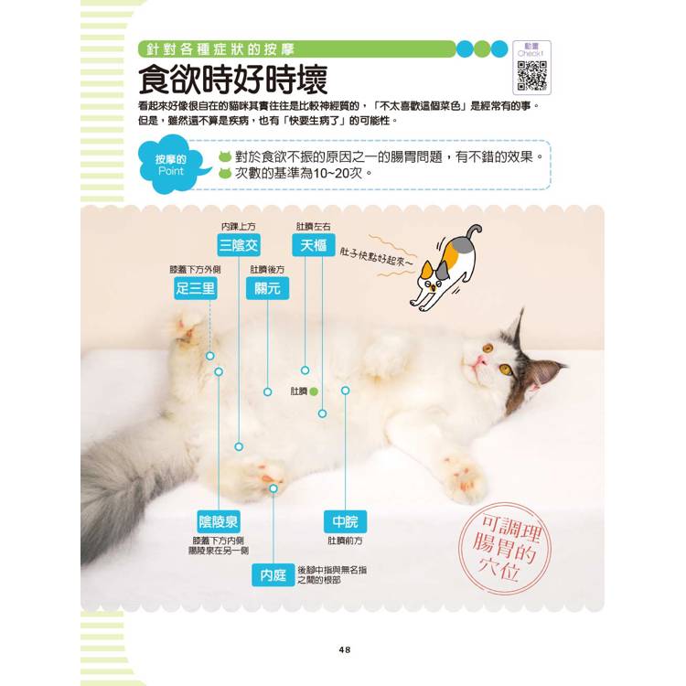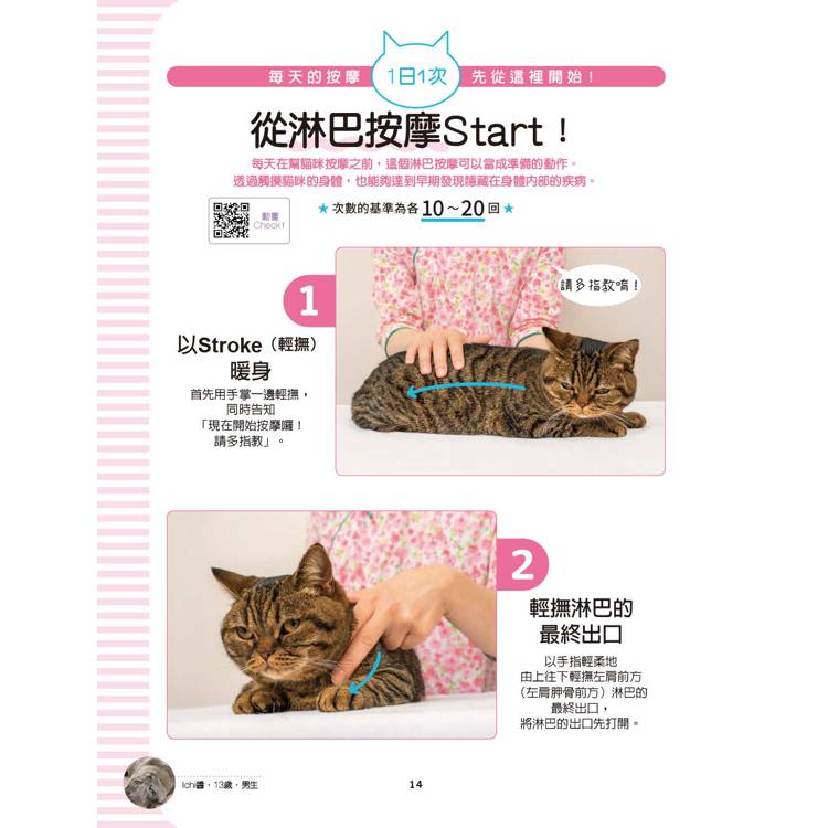 書中一共介紹18組按摩手法,每組動作都以真實照片詳細圖解步驟,並解說對應到的經絡、淋巴與穴位,每天只要花幾分鐘,就能為愛貓帶來身心靈的改善與放鬆。此外,每種按摩手法都附有示範影片QR Code,即使是完全沒有經驗的飼主,也能安心學習、輕鬆上手。
