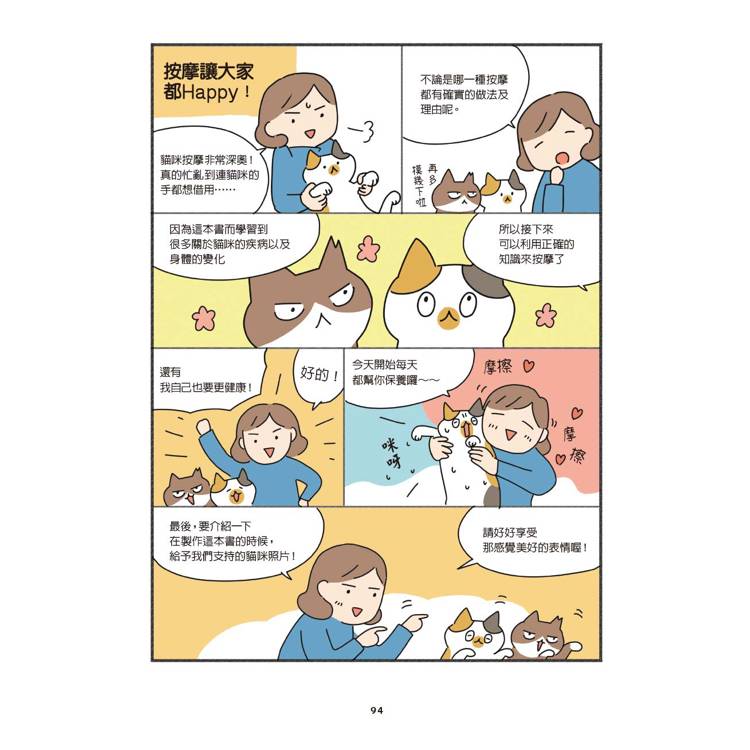 貓咪經常關注飼主的狀態。比起生氣的表情,他們應該更能夠記得溫柔安穩的表情所帶來的安心感。雖然喵皇看似非常強勢,但其實是非常纖細的動物。能夠與貓貓一起享受按摩所帶來的幸福感,是我最快樂的一件事。本書所提到的穴位按壓方式中,重要的是要在按壓時「注入情感」,從今天就立即開始試試看吧。