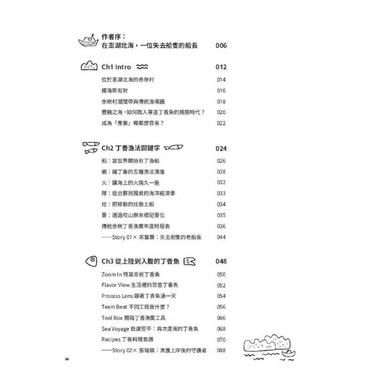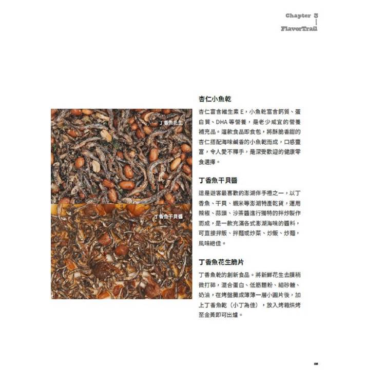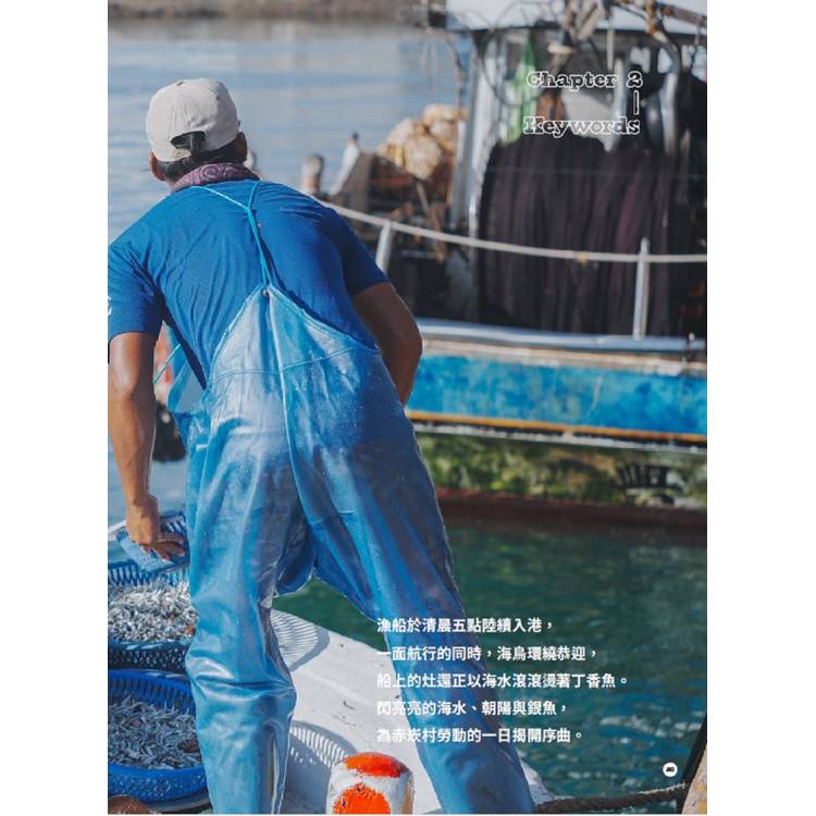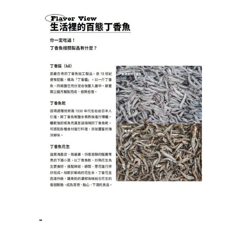 書中同時收錄四道丁香魚料理食譜與漁業影像圖輯。以台灣飲食中最日常的丁香魚為引,回望澎湖赤崁這片全台僅存的丁香漁業場域。從逐漸失落的捕撈技術,到漸次淡去的用海知識,這些文字與影像試圖喚回我們作為海民的記憶與身世,讓那片無門牌、無界碑,卻在漁人心頭清晰存在的「地方」,再次被看見。