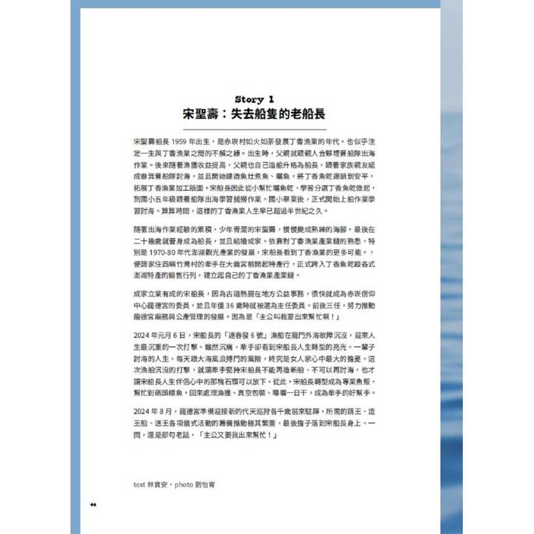 或許我們此生未必有機會真正出海、撒網,但透過這本書,讀者得以跟隨團隊的實地田調,聆聽老船長、編網師、製冰廠老闆與新生代船長的生命故事,穿梭於口耳相傳的地方傳說之中,觸摸那一層層海洋與島民交織的時代肌理。