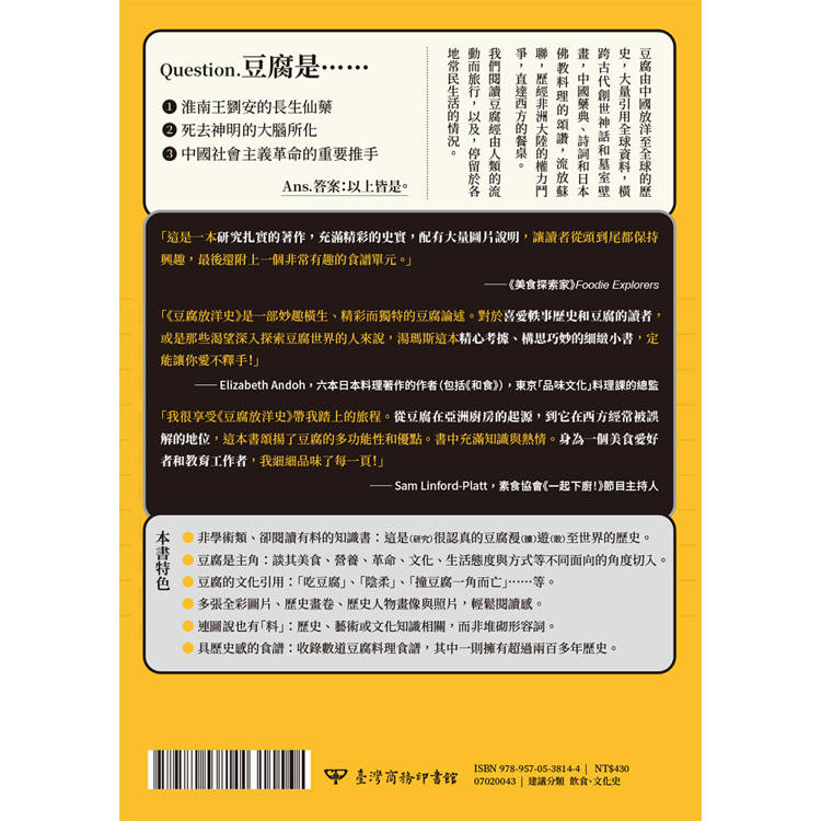 ★「這是一本研究扎實的著作,充滿精彩的史實,配有大量圖片說明,讓讀者從頭到尾都保持興趣,最後還附上一個非常有趣的食譜單元。⋯⋯湯瑪斯的《豆腐放洋史》將永遠改變你對豆腐的看法,並有望鼓勵你將這種美味的食材納入你的烹飪範疇。」