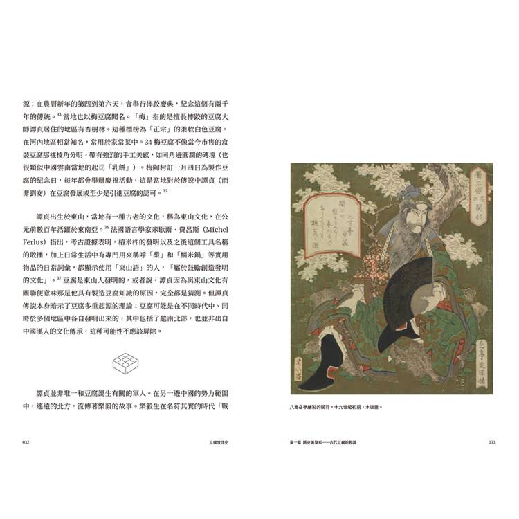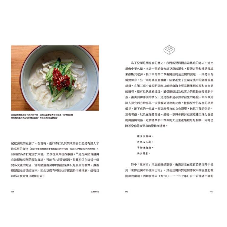 為了全面追溯豆腐的歷史,我們需要回溯非常遙遠的過去。遠比想像中更久遠。本書一開始會介紹豆腐的誕生,從語言學和神話傳說來推斷其起源。接下來的第二章要關注的是豆腐的演進,一則是因為需要保存,另一則是讓豆腐發酵,結果產生了豆腐家族中的各種重要成員。在第三章中會說明豆腐以前經由海上貿易傳播到東亞和東南亞的過程,還有近代透過遷徙、遭受驅逐以及軟實力的推動而傳播到中亞、南美洲和非洲的情況,這是些都是必然會發生的過程。第四章則深入探究西方世界第一次接觸到豆腐的反應,挖掘至今仍存在的早期偏見。接下來的一章會一探豆腐帶來的文化影響,包括了俚語俗語、宗教習俗,以及在媒體描述。最後一章將會探討豆腐這種全球化食品的興盛與衰落,這個產業和不環保的大豆生產過程息息相關,同時也隨著全球飲食要求的變化而演進。