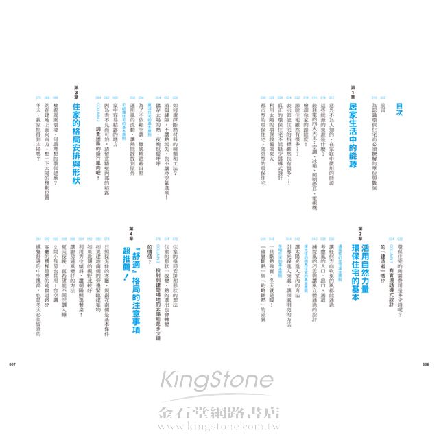 書中幾乎網羅了所有與綠住宅有關的主題,並盡可能地以具體重點來表示。例如節能或節電的效果,以及能夠得到怎樣程度舒適感的室內環境等,皆盡量以具體化的資訊表現出來。透過這樣的呈現方式方便進行資訊比較,讀者也可以視自己的需求,針對規畫的內容進行優先順位的排序。