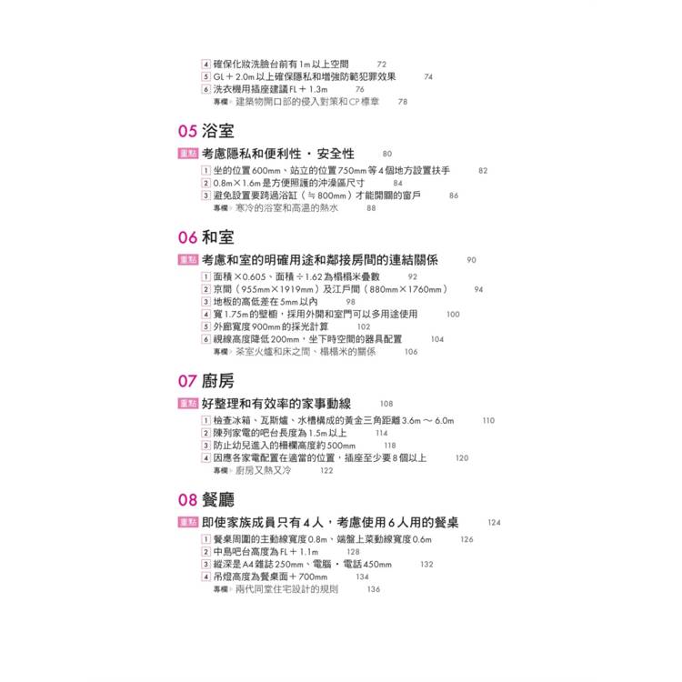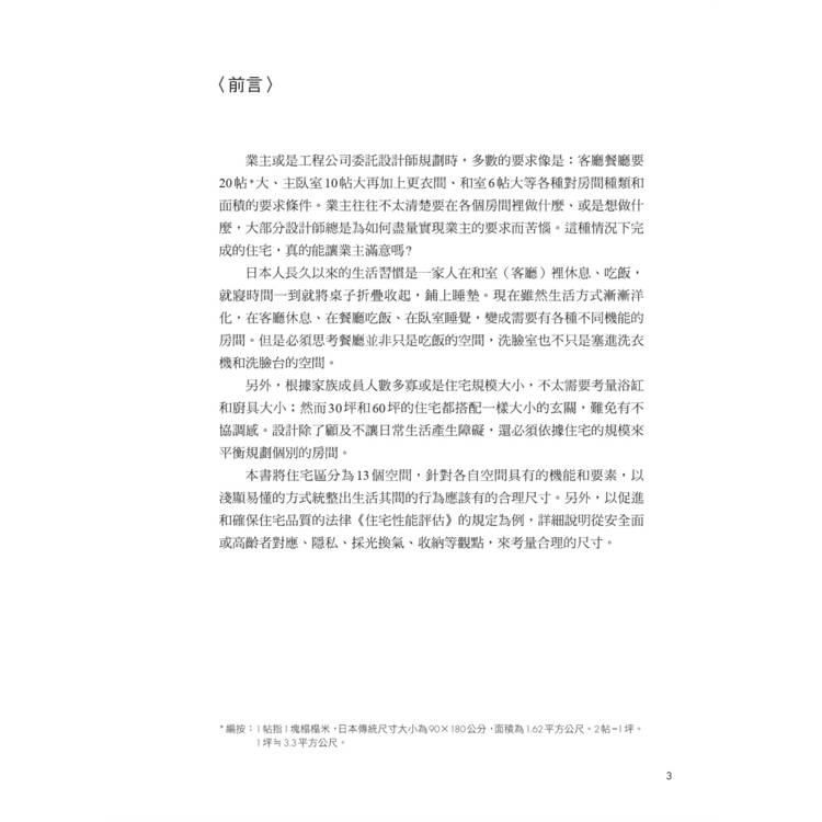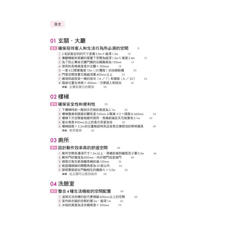 本書將住宅區分為13個空間(玄關、樓梯、廁所、洗臉室、浴室、和室、廚房、餐廳、客廳、主臥室、小孩房、衣帽間、陽台),針對各自空間的機能、配置和重要功能,淺顯易懂地統整出其間的生活行為所應該有的合理尺寸。並特別將高齡者的安全及無障礙設施納入設計考量。是一本針對專業住宅設計者、考慮購買或興建自用住宅人士,對應少子化、高齡化社會相當實用的設計實務參考工具書。