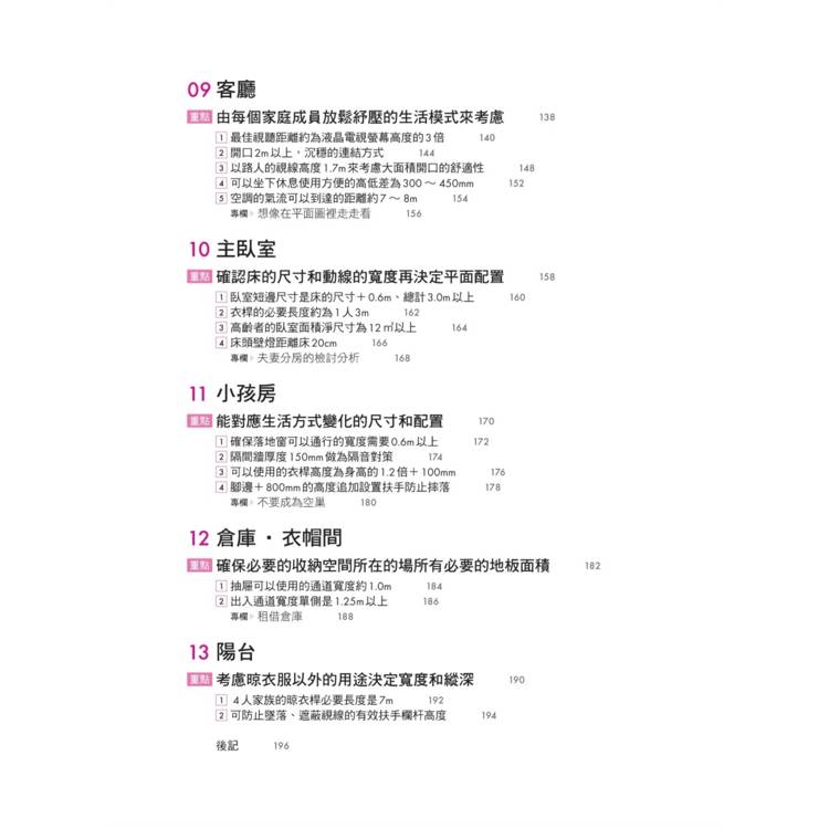本書將從以下面向帶你細膩掌握13 個住宅空間最適尺度: