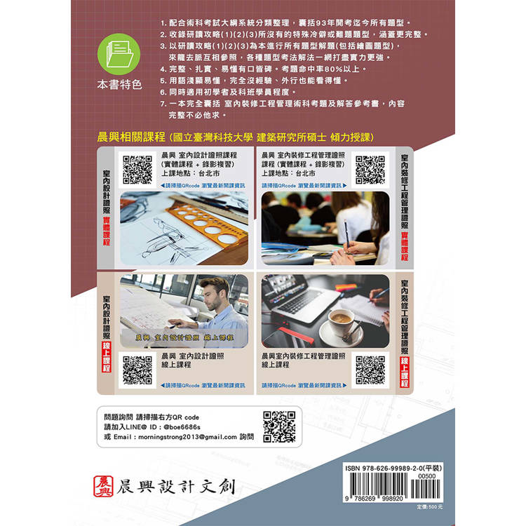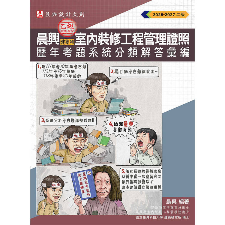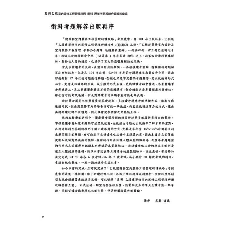 如今本書的完成,正可說完成了「乙級建築物室內裝修工程管理研讀攻略」考照叢書的最後一塊拼圖。除了研讀攻略三冊、再加上學科題庫逐題解析、及術科歷年題型系統分類解答彙編總共五冊,可以號稱「晨興 乙級建築物室內裝修工程管理研讀攻略登榜五寶」 正式登場。期望這套登榜五寶,能幫助更多的學員及讀者能一舉奪證,並期望讀者能秉持以往的支持,便是對筆者最大的鼓勵。