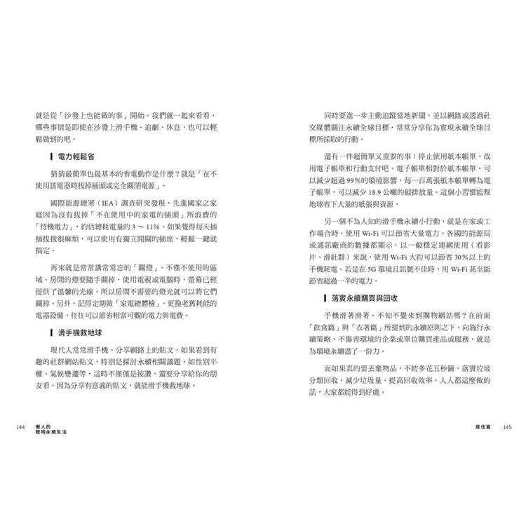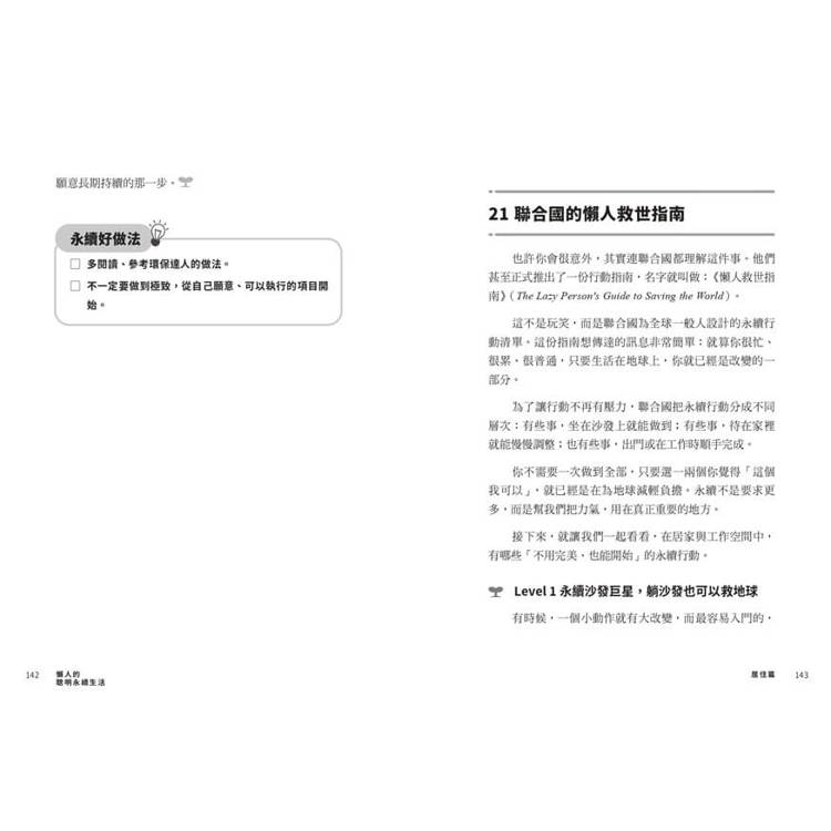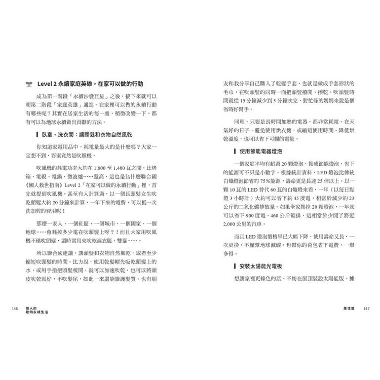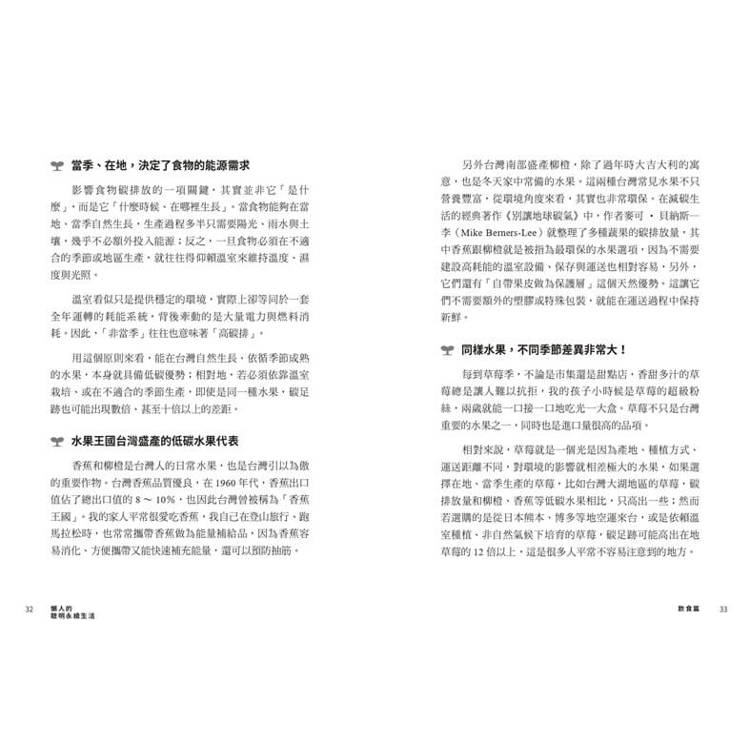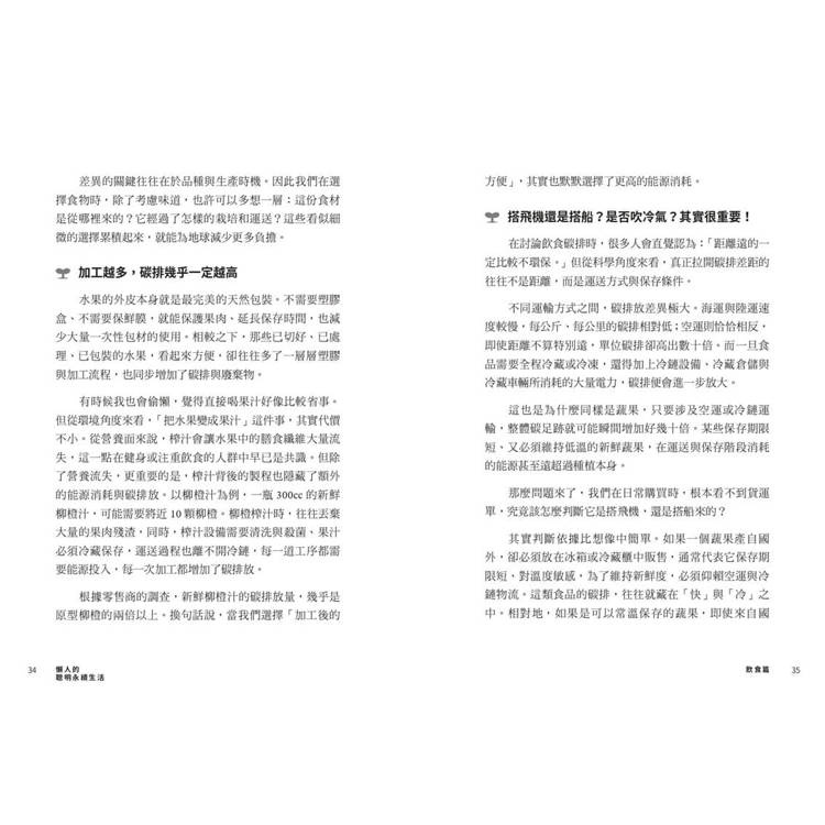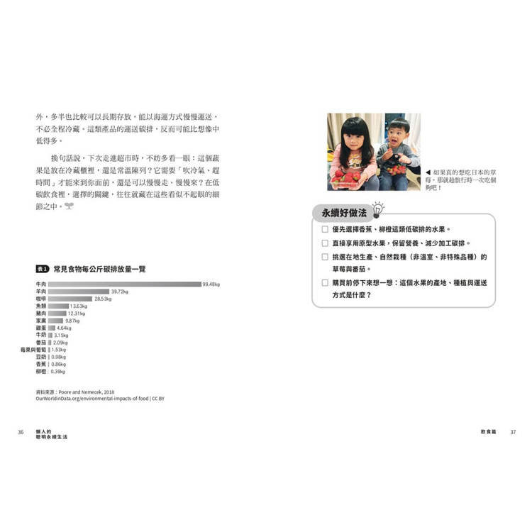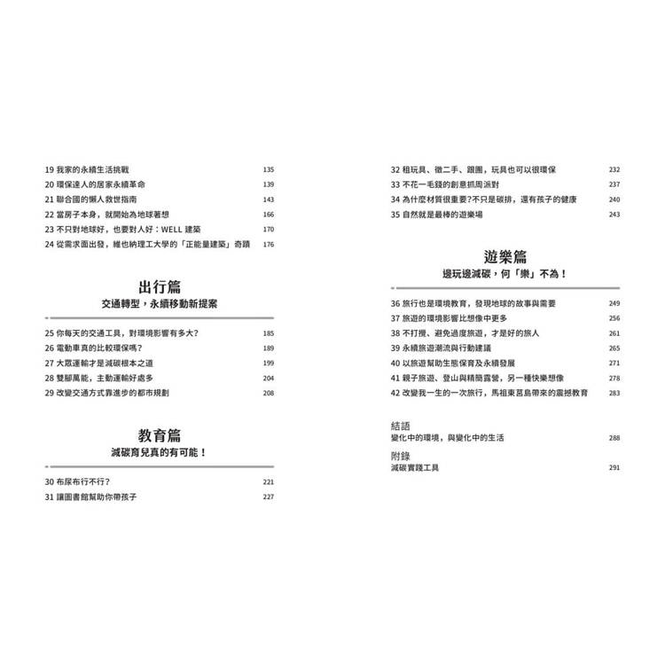 本書中,她從食、衣、住、行、育、樂六大日常面向出發,將複雜的環境議題轉化為一個個可實踐的生活選擇,結合研究數據與親身經驗,帶我們看見: