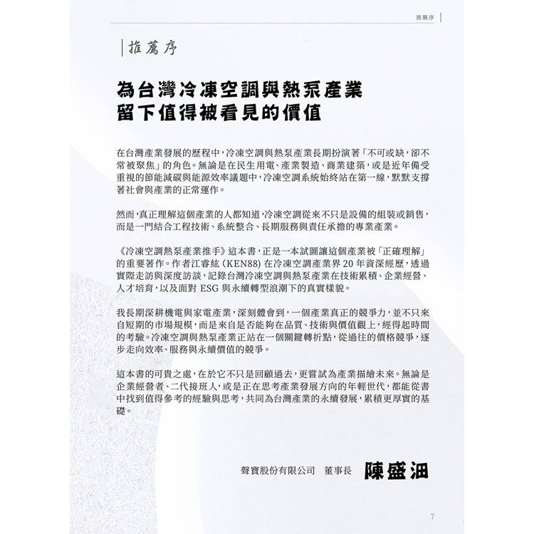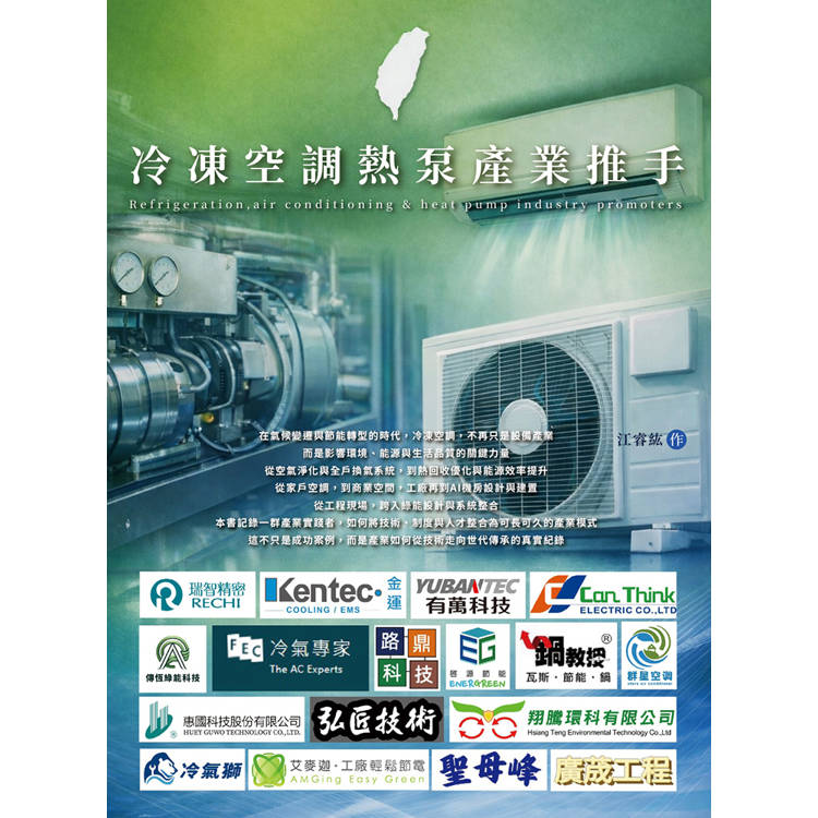《冷凍空調熱泵產業推手》這本書,正是一本試圖讓這個產業被「正確理解」的重要著作。作者江睿紘(KEN88) 在冷凍空調產業界20年資深經歷,透過實際走訪與深度訪談,記錄台灣冷凍空調與熱泵產業在技術累積、企業經營、人才培育,以及面對 E SG 與永續轉型浪潮下的真實樣貌。