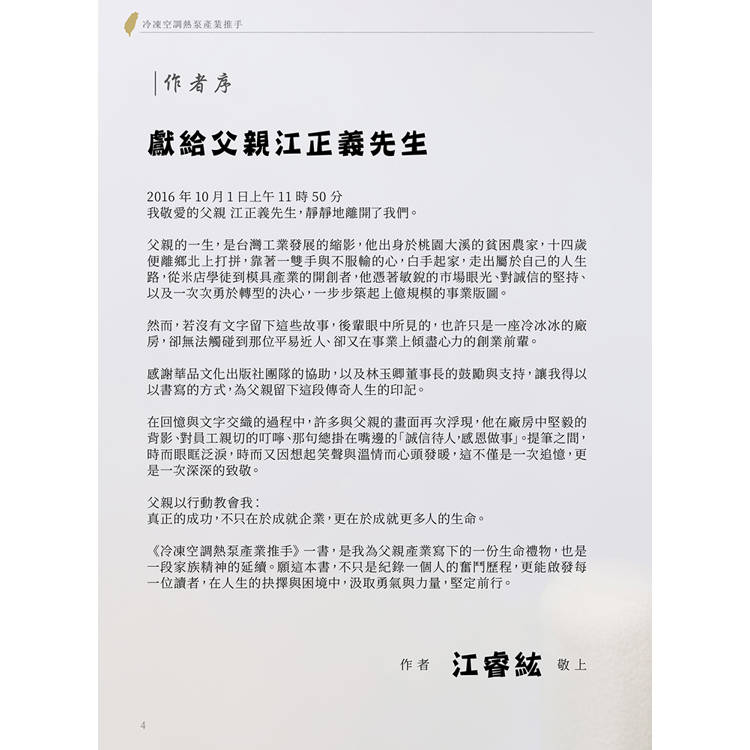 《冷凍空調熱泵產業推手》一書,是我為父親產業寫下的一份生命禮物,也是一段家族精神的延續。願這本書,不只是紀錄一個人的奮鬥歷程,更能啟發每一位讀者,在人生的抉擇與困境中,汲取勇氣與力量,堅定前行。