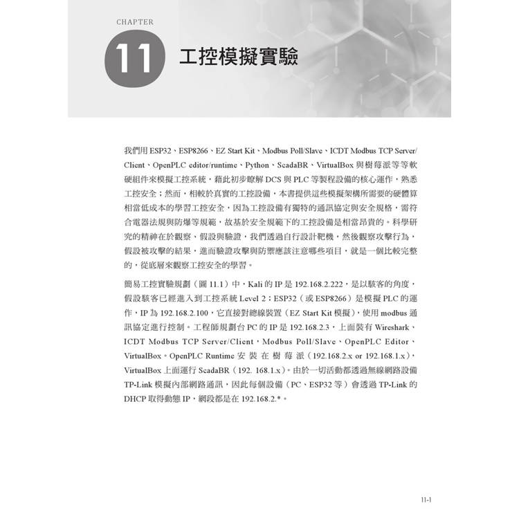 對於關鍵基礎設施來說,無論複雜度高低,都同樣重要,皆關乎民生的基礎設備。有別於 IT 領域的安全需求,在 OT 領域中,Safty 才是主要的議題。作者在書中介紹了工控領域常見的 SCADA、DCS、PLC 系統,並製作靶機以學習攻防技術。在十個工控模擬實驗中,透過軟硬體模擬成的 ICS 基本架構 Level 0 - 2,讓讀者能夠用駭客工具進行攻擊,深入理解攻防技巧。