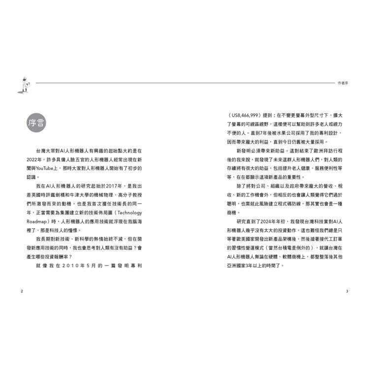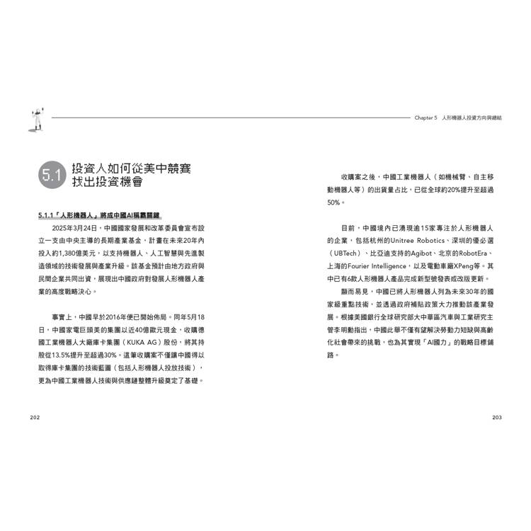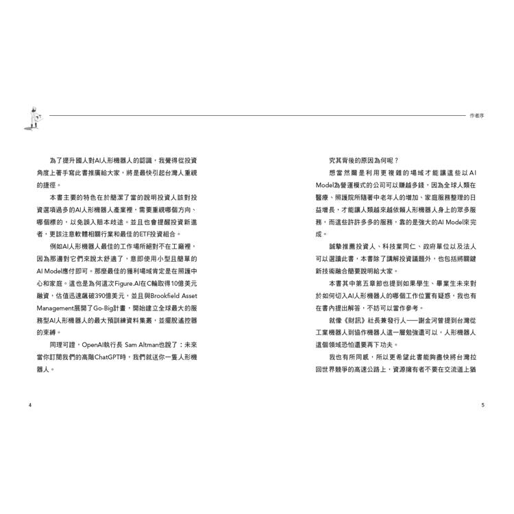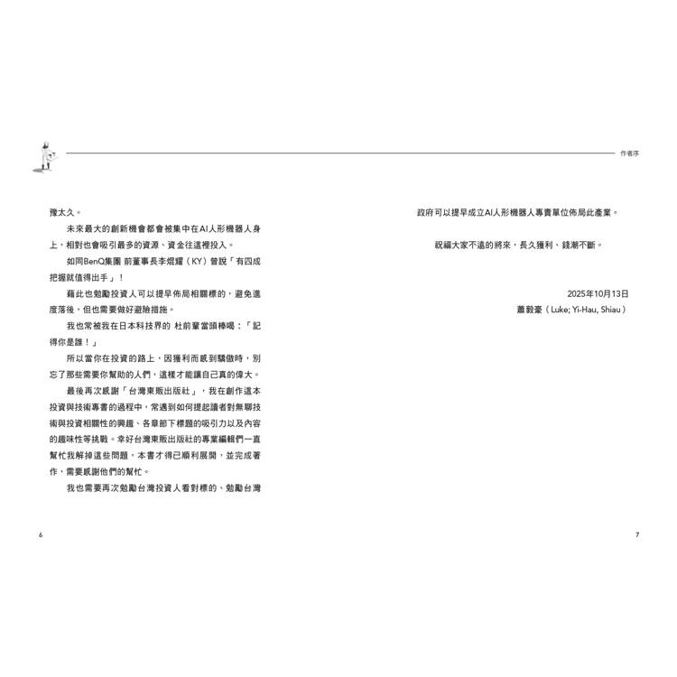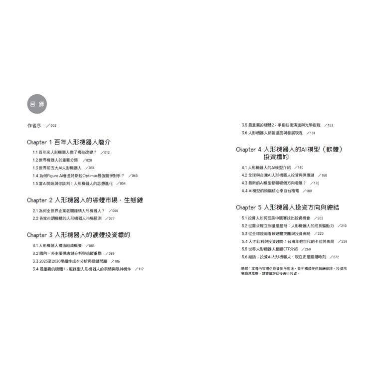 這不是一本教你追高炒作的書,而是一本教你如何看懂科技脈動、掌握硬體與AI模型投資機會的書。讓資金成為助力,而不是負擔;讓投資人形機器人產業不再茫然,而是清楚、有策略,並帶著前瞻力抓住未來科技與市場的機會。