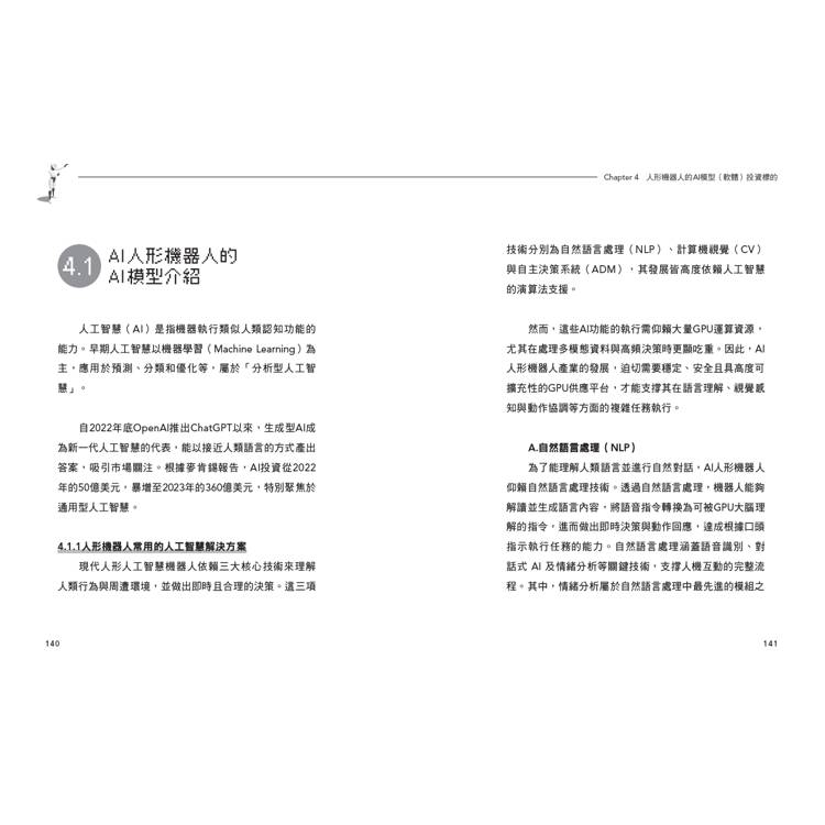 深入探討人形機器人的AI模型運作原理與核心技術,介紹台灣與國際的AI模型供應商及其發展方向,分析全球研發趨勢,並說明AI模型運算核心與晶片製造的密切關聯,使讀者能了解軟體技術對人形機器人發展的重要性及潛在投資價值。