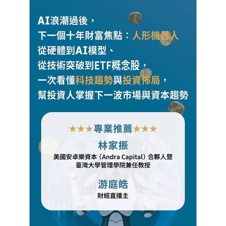 從百年人形機器人的技術演進、全球市場、生態鏈,到硬體與AI模型投資標的,以及投資策略與ETF布局,本書提供完整知識地圖,陪你全面掌握產業脈動,把握當下最關鍵的投資時刻。