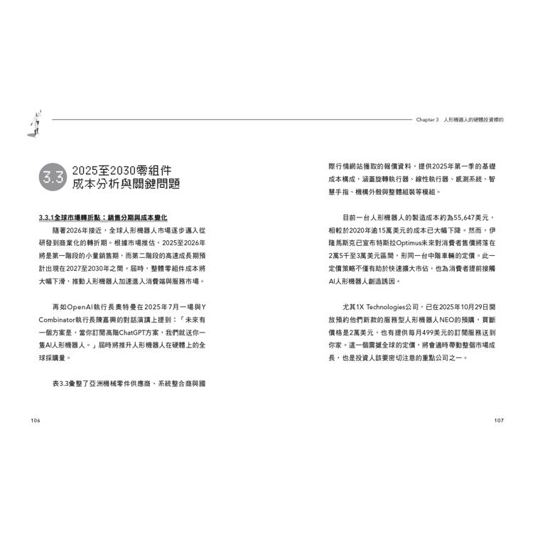 詳細介紹人形機器人的硬體構造與核心零組件,從表情、眼神模組到手指技術及光學指腹,全面解析國內外供應鏈及其追蹤重點,預測未來零組件成本趨勢,並呈現人形機器人的銷售進度與發展現況,使讀者清楚掌握硬體技術演進與投資機會。