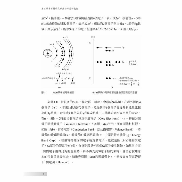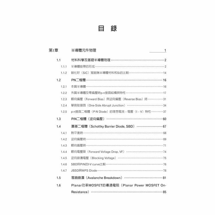然而,SiC功率元件的設計與製造,並非僅是將矽元件的概念直接延伸,而是牽涉到材料特性、元件物理、製程技術以及電性量測等多層面的整合。本書即是基於上述實務需求而進行系統性的撰寫,目的在於建立一條從半導體元件物理、製程技術、SiC功率元件結構與製作流程,到實際電性量測與參數萃取的完整技術脈絡。內容首先由半導體能帶與PN接面物理出發,逐步說明碳化矽材料相較於矽的關鍵差異,並深入探討Schottky二極體、JBS/MPS結構、雪崩崩潰,以及Planar與Trench功率MOSFET的導通電阻組成與物理意義。