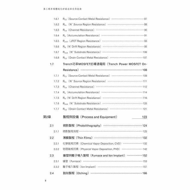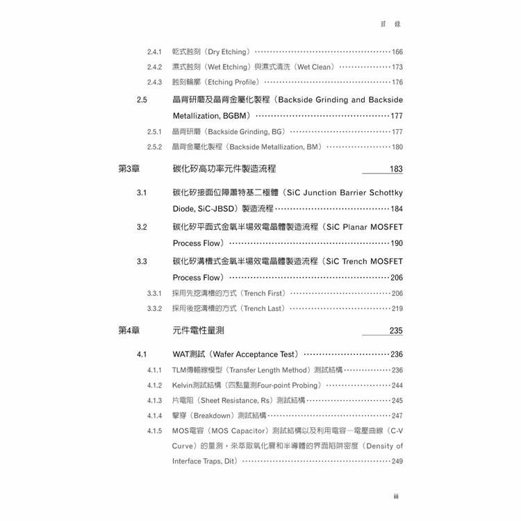 在製程部分,本書不僅介紹各項基礎製程原理,更著重於其在SiC元件製造中的實際角色與技術限制,包括微影、薄膜沉積、氧化製程、離子植入、蝕刻以及晶背研磨與金屬化等關鍵技術,並以實際的SiC功率元件製作流程作為整合說明。