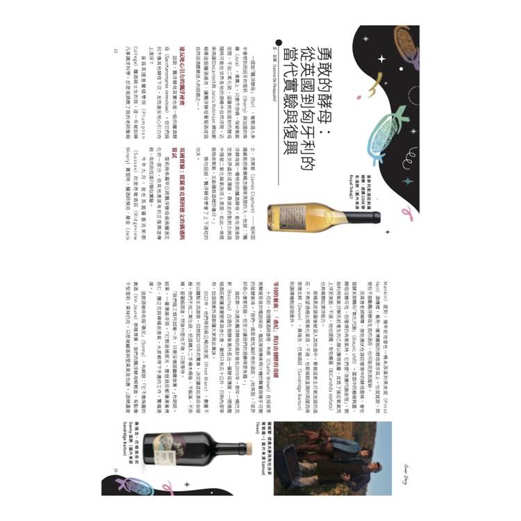 從西班牙桑盧卡的酒花(flor)到法國侏羅的薄紗(voile),書中追溯飄浮酵母的歷史、風味與地理變奏,揭示生物培養這項古老技藝如何在當代被自然派釀酒師重新喚醒 。同時也走訪全球釀酒現場──從雪莉區的風土哲學家拉米洛.伊巴涅茲(Ramiro Ibáñez) 、到匈牙利托凱的復興實驗、再到英國與澳洲的自由發酵實驗室 ──呈現一場跨越地域與世代的「酵母復興運動」。