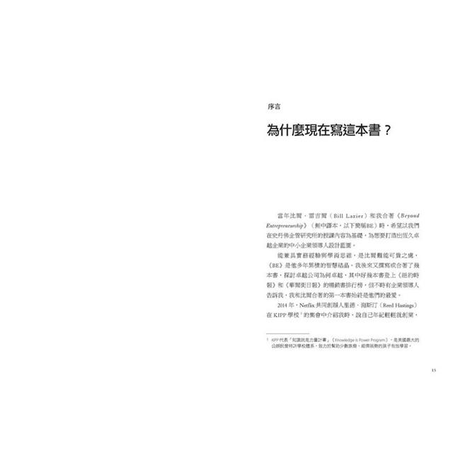 三十年前,柯林斯與人生導師比爾‧雷吉爾共同在史丹佛商學院開設「創業與小企業管理」,非常受歡迎,兩個人並將課程精華撰寫成書,當時一出版即成為矽谷經典。那本書也是Netflix創辦人里德‧海斯汀(Reed Hastings)創業路上最重要的一本參考書,每年都重讀一遍,打造出今日的串流巨人。