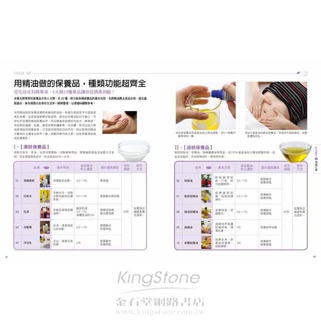 天天都要用的洗面皂,化妝水、乳液,還有面膜、眼霜、精華液,甚至是卸妝油、去角質霜、護唇膏……,188種美體保養用品,一次通通教給你!囊括清潔、滋養、美白、抗老四大功能,甚至還有按摩油、鎮痛貼布,兼顧紓壓、療癒的需求,只要一個人學會,全家無論男女老少都能享受到天然精油保養品的美好!全身從頭到腳、由裡到外,都潔淨清爽、年輕美麗!