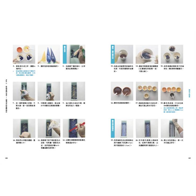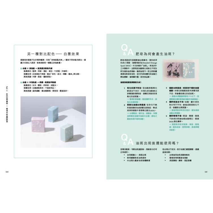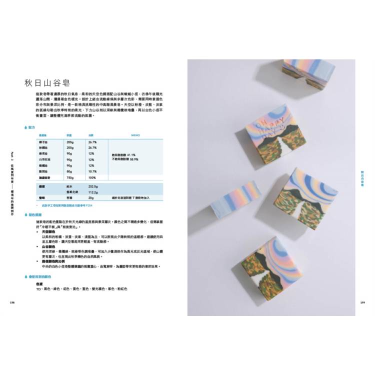 風景皂並非憑直覺完成,從皂液注入的角度、流動方向、色塊落點到層次比例,其實都有可學的順序與技巧。本書透過清楚的步驟示範,帶你理解皂液如何在切面中形成線條、圖形與景深,完成乾淨俐落、自然耐看的漂亮皂景。