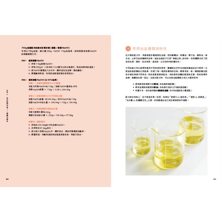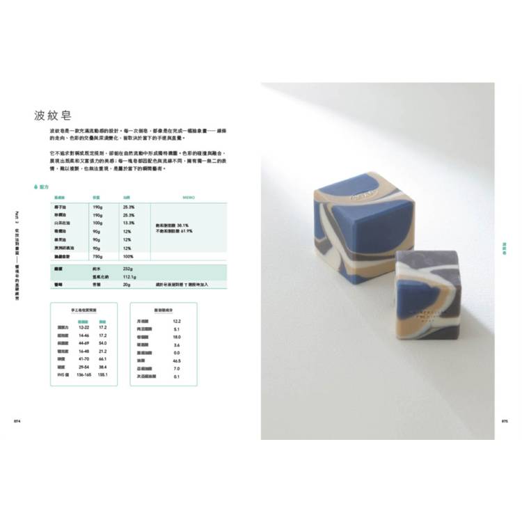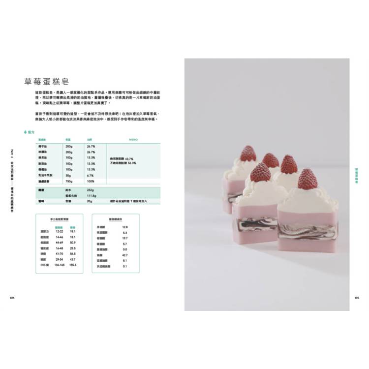 每款作品皆提供完整配方,並搭配「手工皂性質預測表」與「脂肪酸成分表」,清楚呈現清潔力、起泡度、保濕度與硬度等洗感特性。透過數據對照,不僅能理解各配方的實際使用表現,也能作為日後調整與優化洗感的依據。
