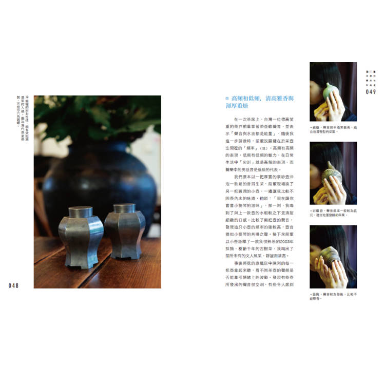 我不懂禪,也不敢輕易碰觸「茶禪一味」,〈以茶入禪〉卻是本書最重要的章節之一。我以對茶的理解,與覺知力為根基,企圖逐步驗證古往今來入禪的行者,與熱衷於禪的飲者,應該有的對茶和器的認知與高度。