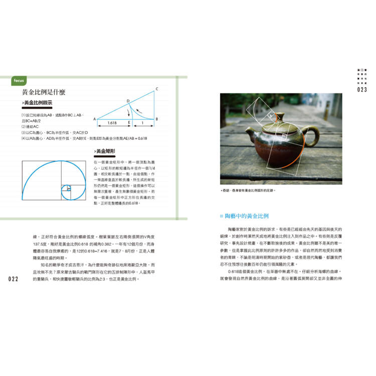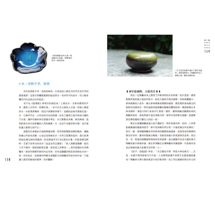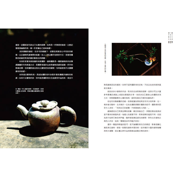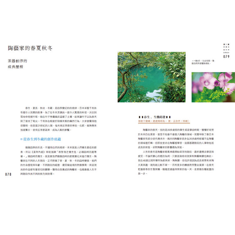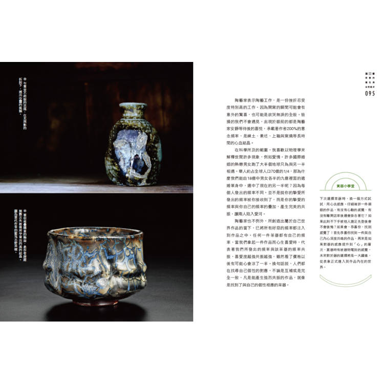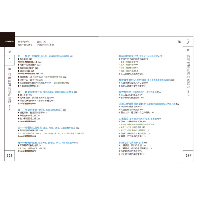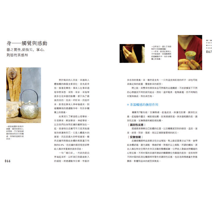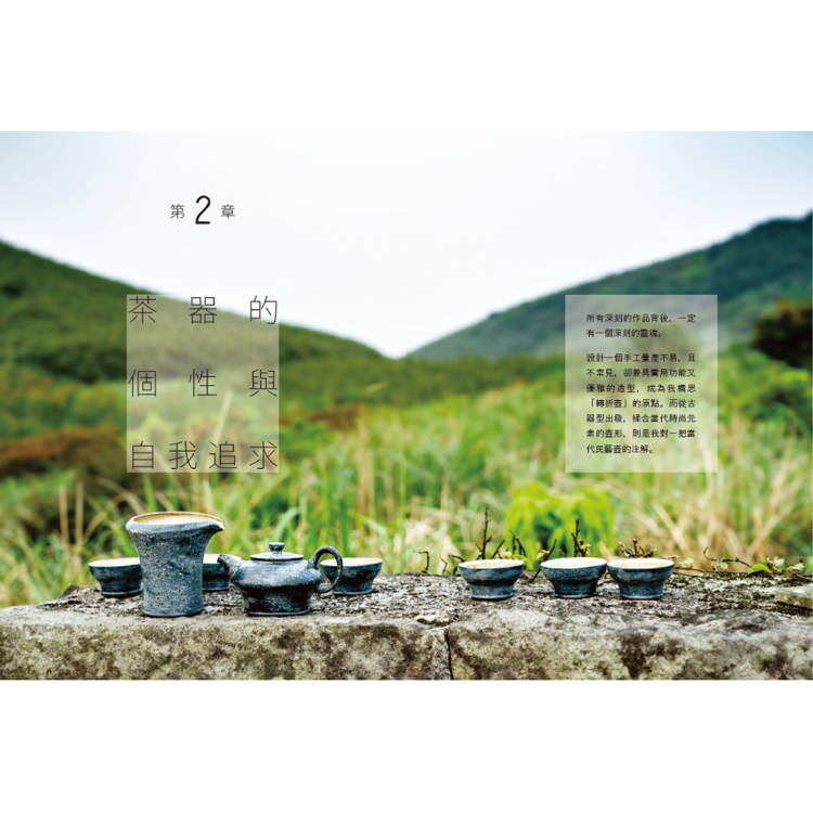 作者將茶器審美分為三個階段,實用性、個性、精神性。在實用性裡以眼、耳、鼻、舌、身的五感,作為對於茶器初階的認識。在個性中以春、夏、秋、冬對應到陶藝家與使用者,在人生不同階段的歷練和喜好。