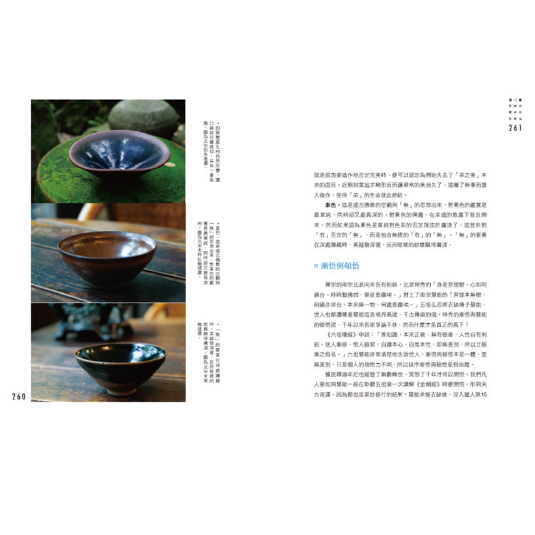 〈以茶入禪〉為本書最重要的章節之一。作者以對茶的理解,與覺知力為根基,企圖逐步驗證古往今來入禪的行者,和熱衷於禪的飲者,應該有的對茶與器的認知和高度。