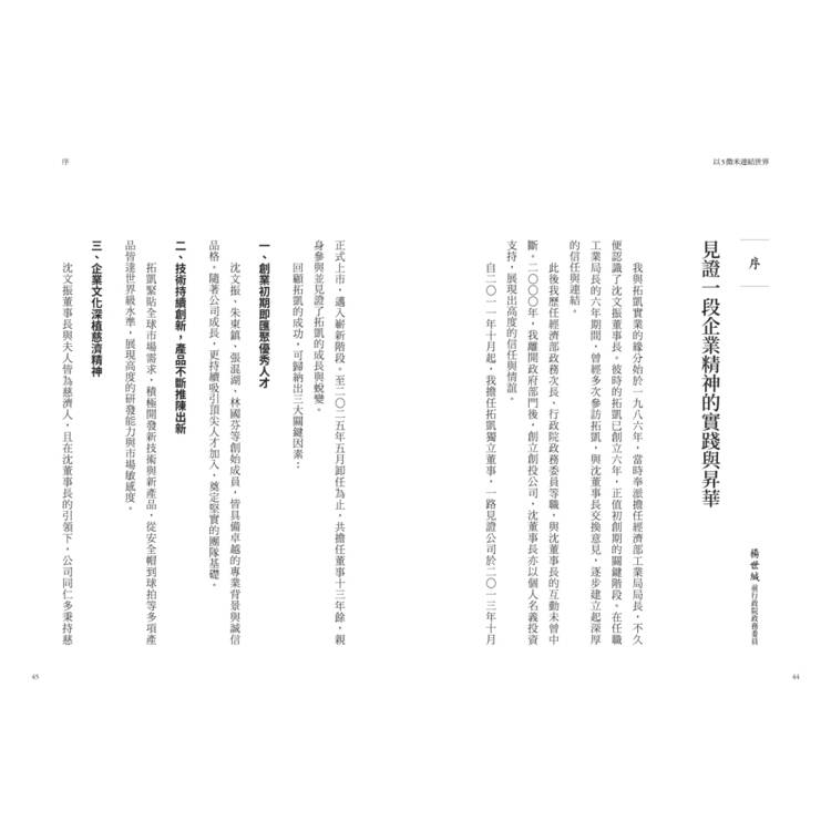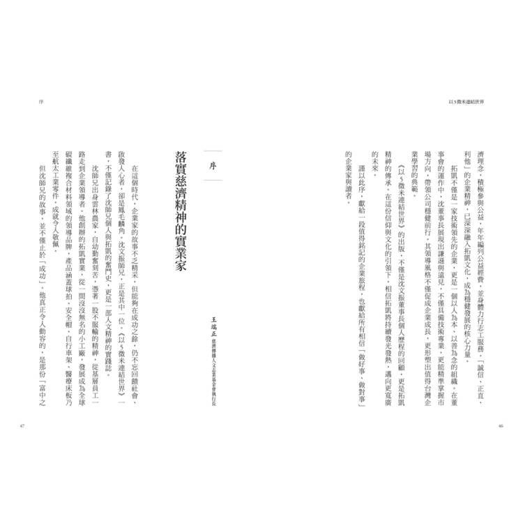 在這個時代,企業家的故事不乏精采,但能夠在成功之餘,仍不忘回饋社會、啟發人心者,卻是鳳毛麟角。沈文振師兄,正是其中一位。以《5微米連結世界》一書,不僅記錄了沈師兄個人與拓凱的奮鬥史,更是一部人文精神的實踐誌。