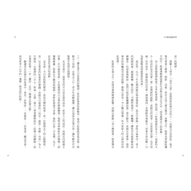 在這本書中,我看見的不只是企業的成長,更是人心的成長。沈師兄內修誠正信實,外行慈悲喜捨,正是慈濟四大志業的精神體現。他與美華師姐生活簡樸,卻慷慨解囊;對孫女不願消耗福報,卻對社會毫不吝嗇。他的公益,不是偶一為之,而是長年累月的深耕。