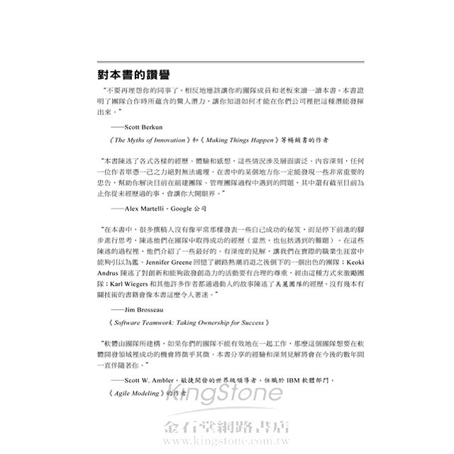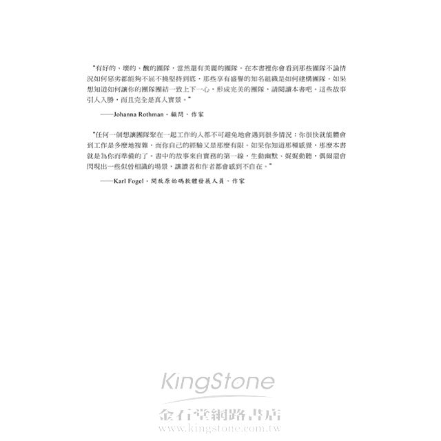“有好的、壞的、醜陋的,當然還有美麗的團隊。在本書裡你會看到那些團隊不論情況如何惡劣都能夠不屈不撓堅持到底,那些享有盛譽的知名組織是如何建構團隊。如果想知道如何讓你的團隊團結一致上下一心,形成完美出色的團隊,請閱讀這本書。”