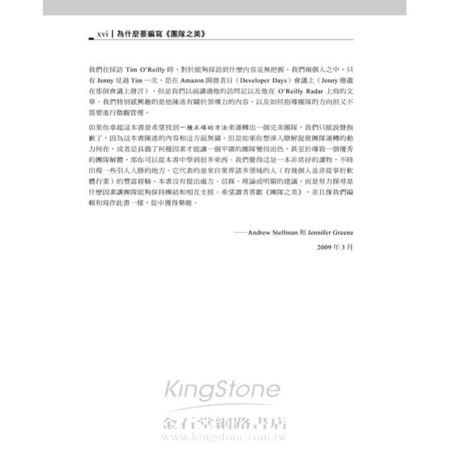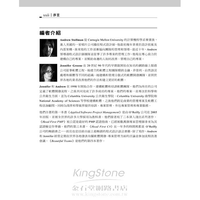 Andrew Stellman 和 Jennifer Greene 是資深的軟體工程師和專案經理。他們自從2005年開始為O'Reilly編寫過幾本暢銷書,包括《Applied Software Project Management》,《Head First PMP》,和《Head First C#》。