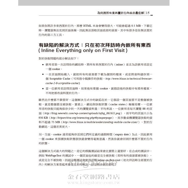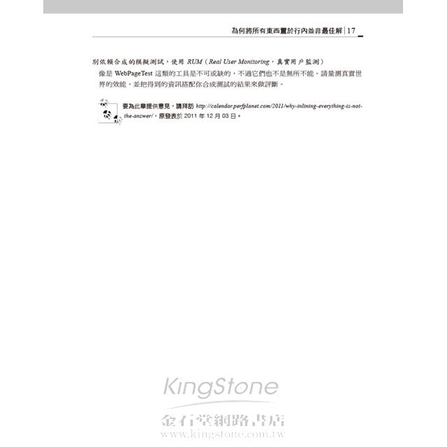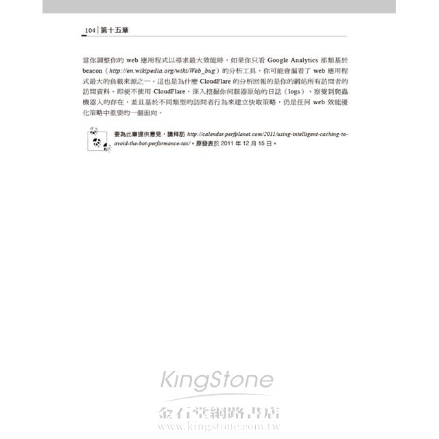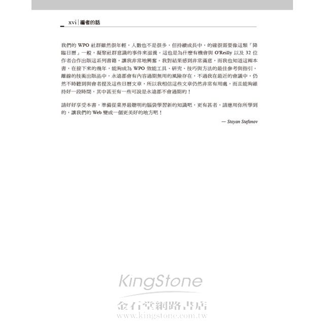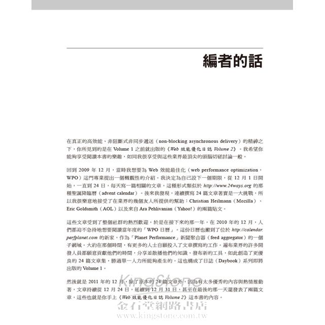 原本是為 Planet Performance 的線上日誌(http://calendar.perfplanet.com)所撰寫,這本文章選集能夠協助你榨取出網站的每一滴效能,不管你是網頁程式開發人員、行動應用程式開發者或網頁設計師,都能夠從中獲益。查閱一下本書目錄,你就會相信所言不假。