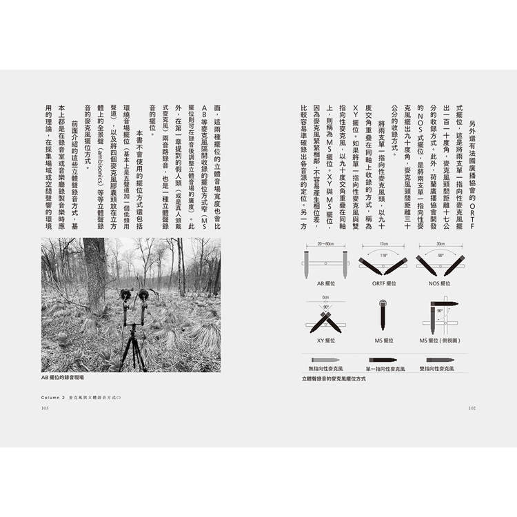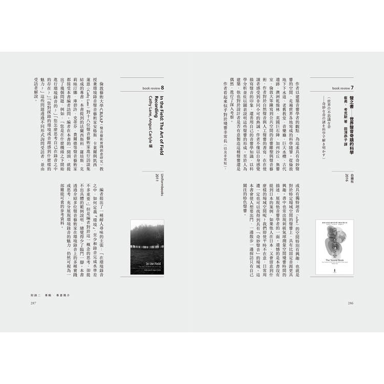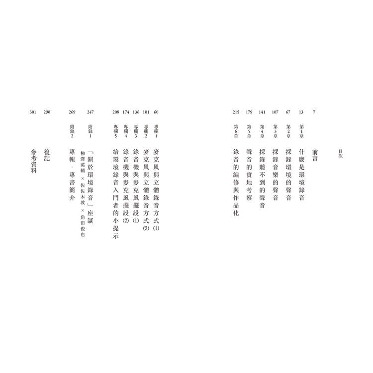 聲音的形狀∣從聲音「再次」遇見且為本已擁有的世界。環境錄音與聲音產生地的歷史、生態環境與錄音者的視角等背景息息相關,本書從當代視角全面概述環境錄音的歷史、理論和實踐,這是涵蓋錄音、聆聽、學術和哲學等主題的入門書,以特殊觀點重新錨定人類所處的位置。而作為錄音作品,聆聽主體可結合多種情感與體驗,描繪各自不同的風景、意象或故事,每每回放,快速捏塑出記憶的形狀。聲音超越立體。環境錄音改變我們看待世界的方式,聆聽不僅經由耳朵,甚至能被整個身體所感受。我們所處的並非由人耳聽得到的周遭「聲音」構成的世界,反而是依賴身體或物體感受(或無法感受)「振動」、「波動」構成的世界。環境錄音是一種透過麥克風觀察與紀錄一個場域、空間聲響的行為。本書以案例講解從自然音、環境音到音樂等各種錄音對象的錄音方式,並談及錄音器材與錄音方式等技術層面,並不重視以「忠實」、「正確」錄製「高音質」特定聲音或音樂的相關方法或秘訣。什麼是「好」的錄音,什麼是「壞」的錄音,並不只取決於「音質」、「忠實性」與「再現性」等觀點。環境錄音更像重新審視好壞基準本身的界線,具有一種作為經驗性、回歸性思考關於聲音與音樂、聆聽行為、身體、場域、風景等各種要素的實踐性意義。