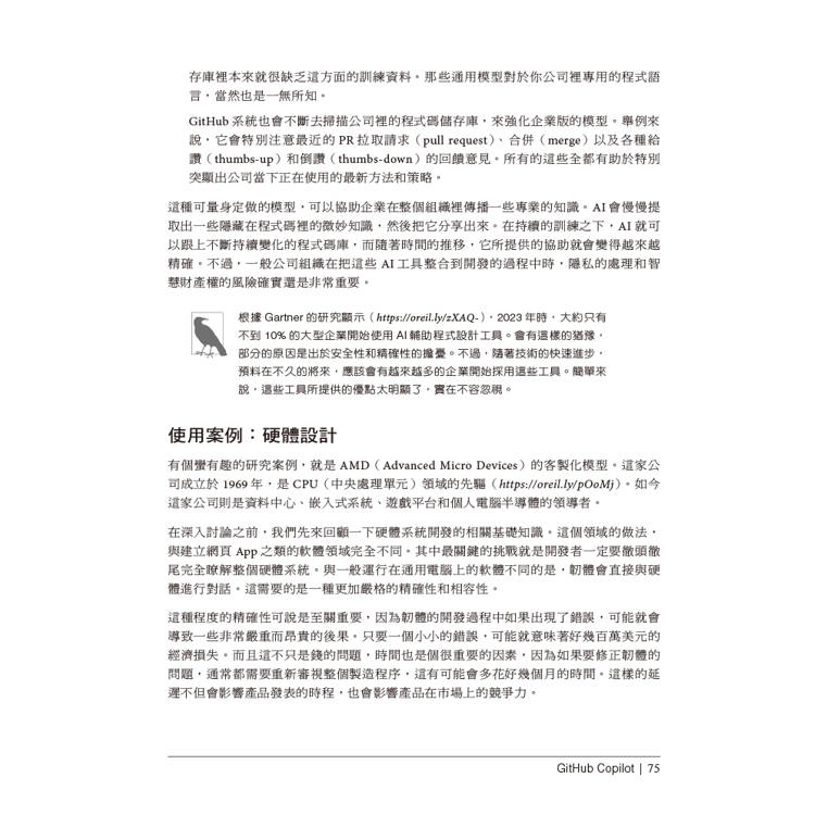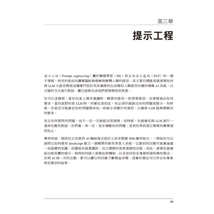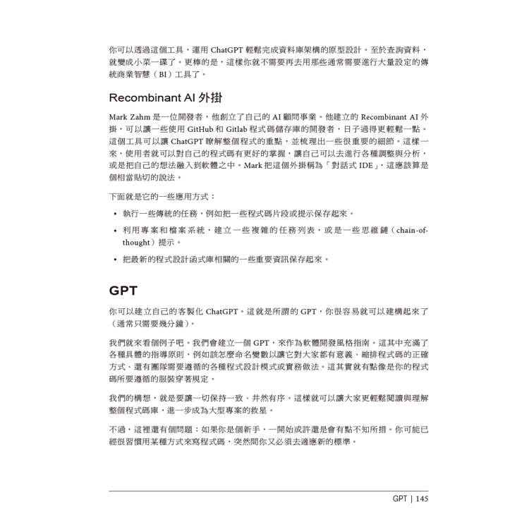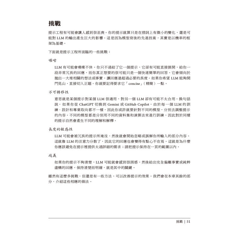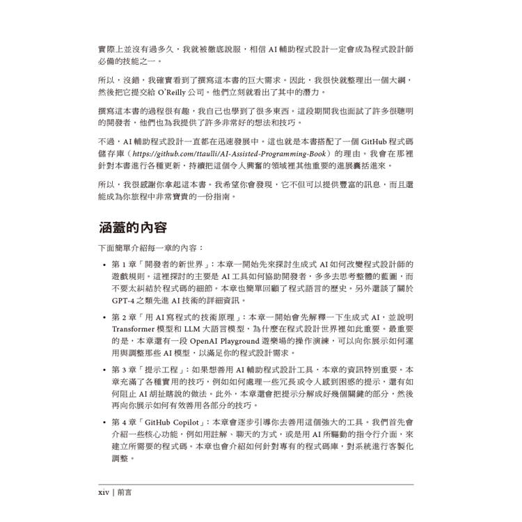 作者Tom Taulli提供了一套完整的模組化程式設計方法論,這套方法論與大家利用提示來生成AI程式碼的做法非常契合。這本指南還介紹了如何以通用的LLM來學習程式語言、解釋程式碼,或是把程式碼從某一種語言轉換成另一種語言的最佳做法。
