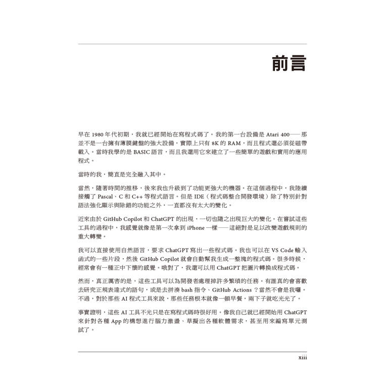 本書不只教你用AI寫Code,並涵蓋從需求規劃、程式設計、測試、部署等完整開發流程,你將學到 AI 在每個階段的最佳實踐。不論是希望加速開發流程的工程師,或是想深入理解AI輔助開發的技術領導者,都能從中獲得超實用的見解。
