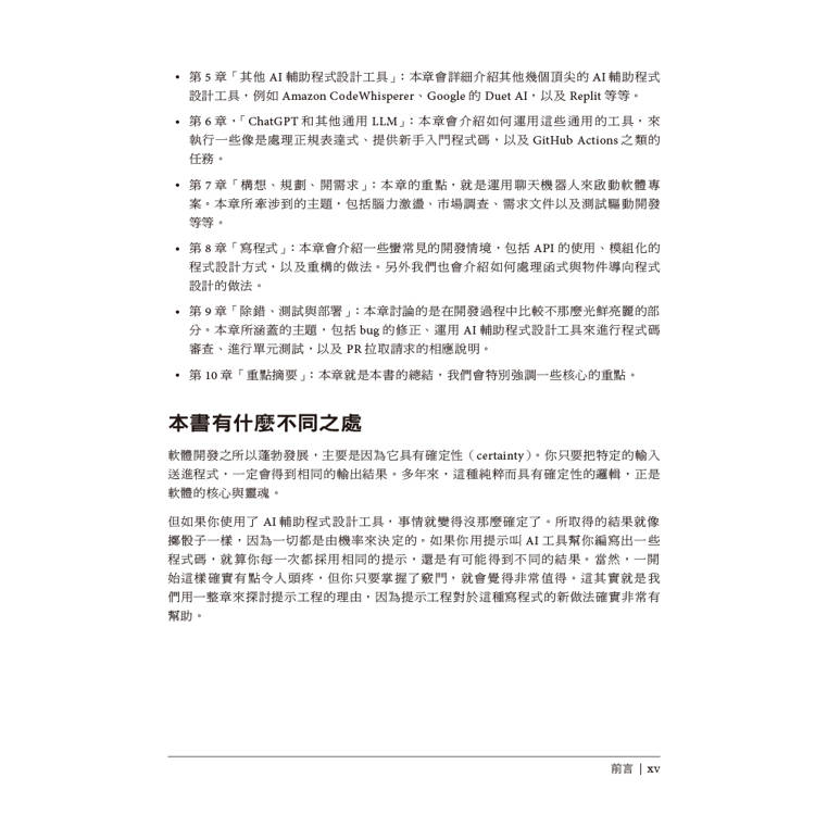 本書會提供一些實用的建議,讓你學會如何把各種AI開發工具運用到創建程式碼的所有階段,包括需求、規劃、設計、編寫、除錯和測試。無論是初學者或資深的開發人員,都可以透過本書學會運用各式各樣的AI工具,涵蓋範圍從通用的LLM(ChatGPT、Gemini和Claude),到專為程式編寫設計的各類系統(GitHub Copilot、Tabnine、Cursor和Amazon CodeWhisperer)。