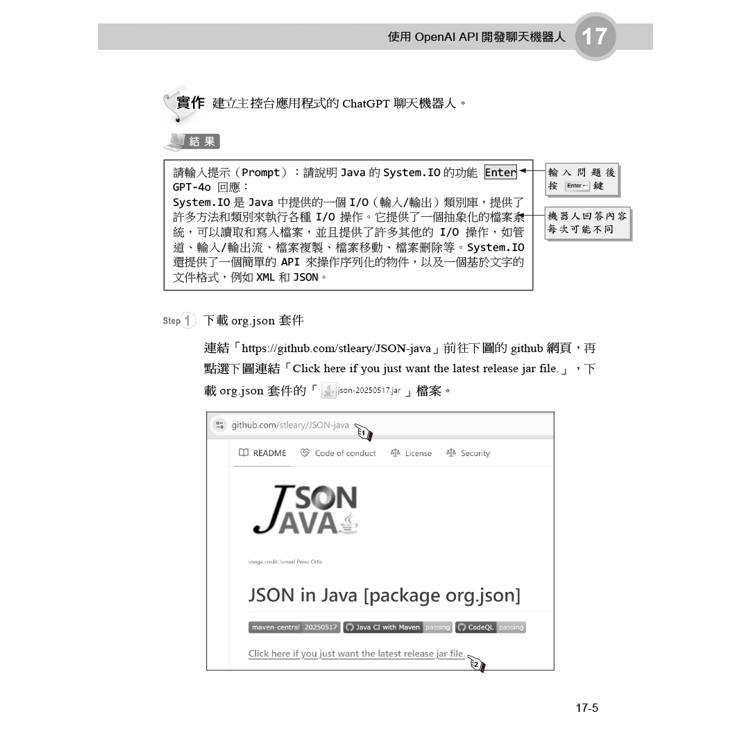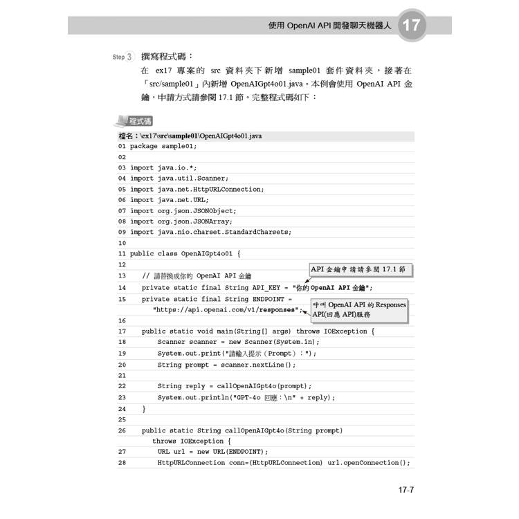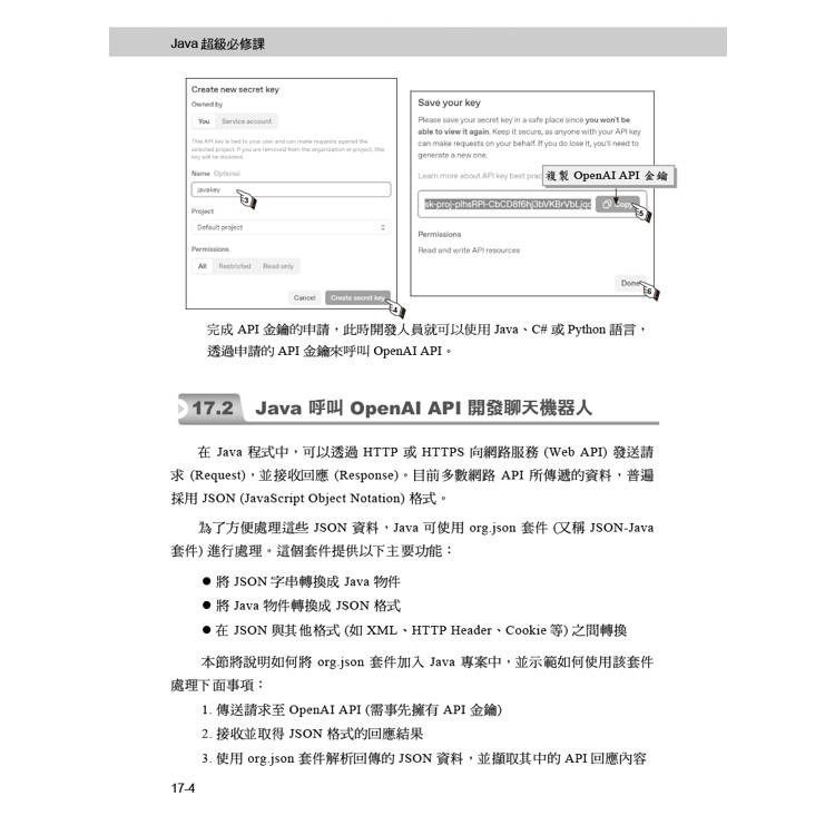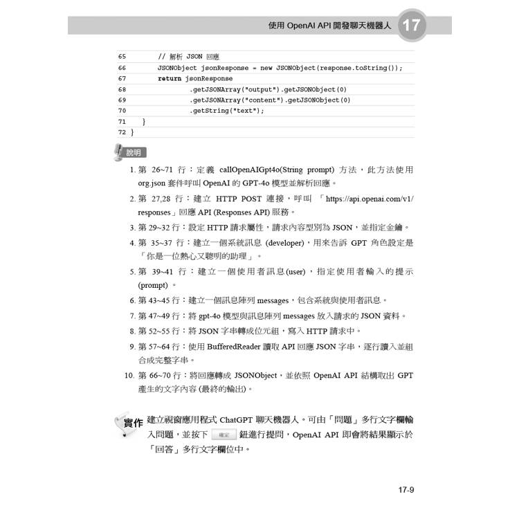 第17章手把手示範OpenAI API申請與使用,帶你打造專屬的Java聊天機器人應用程式。