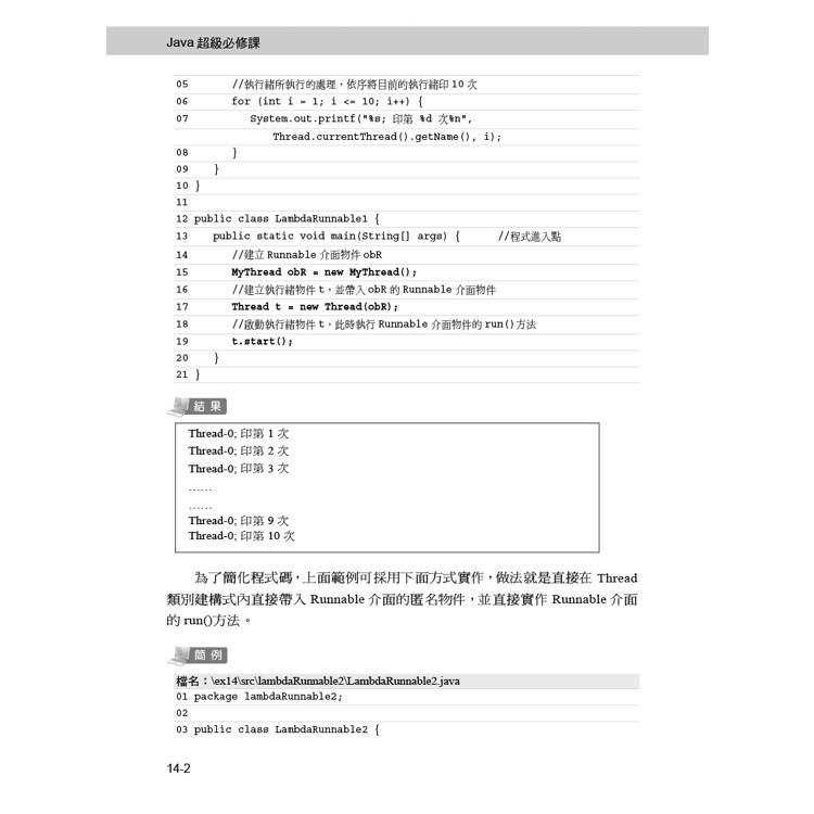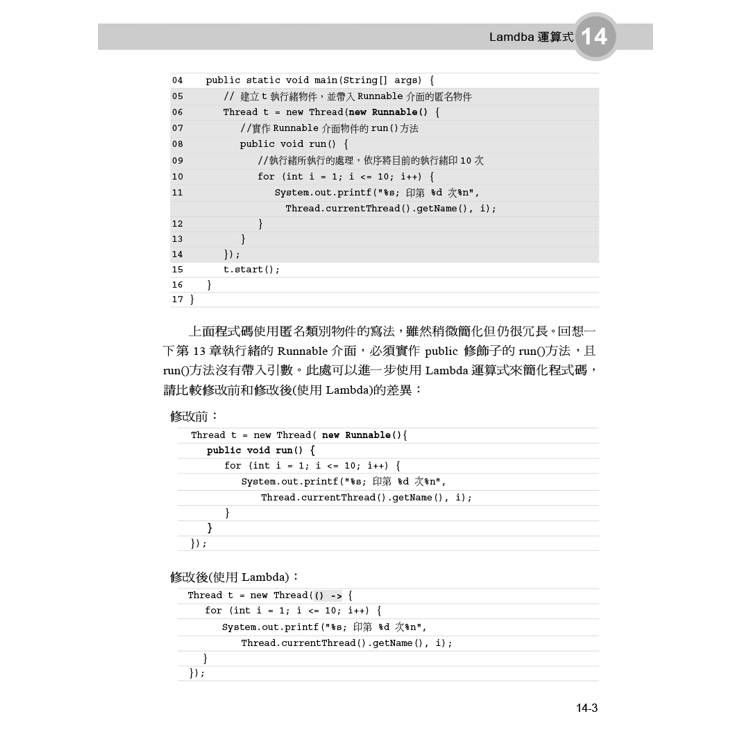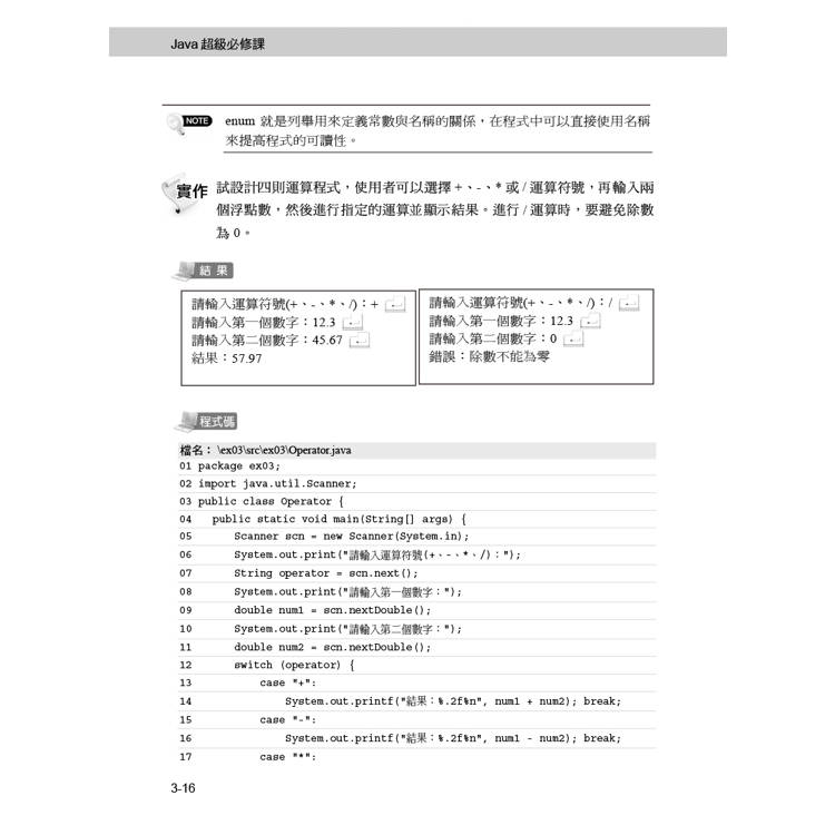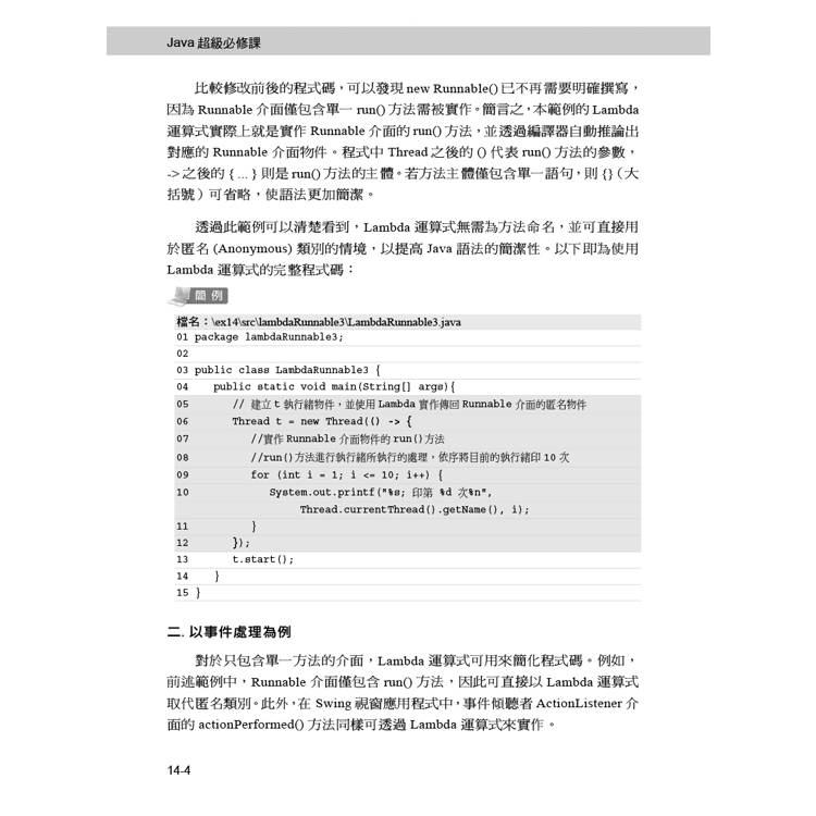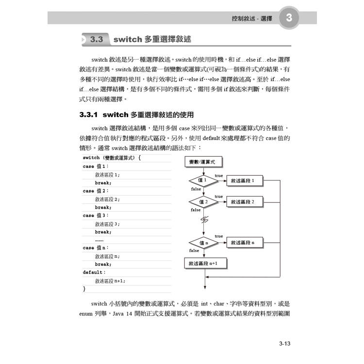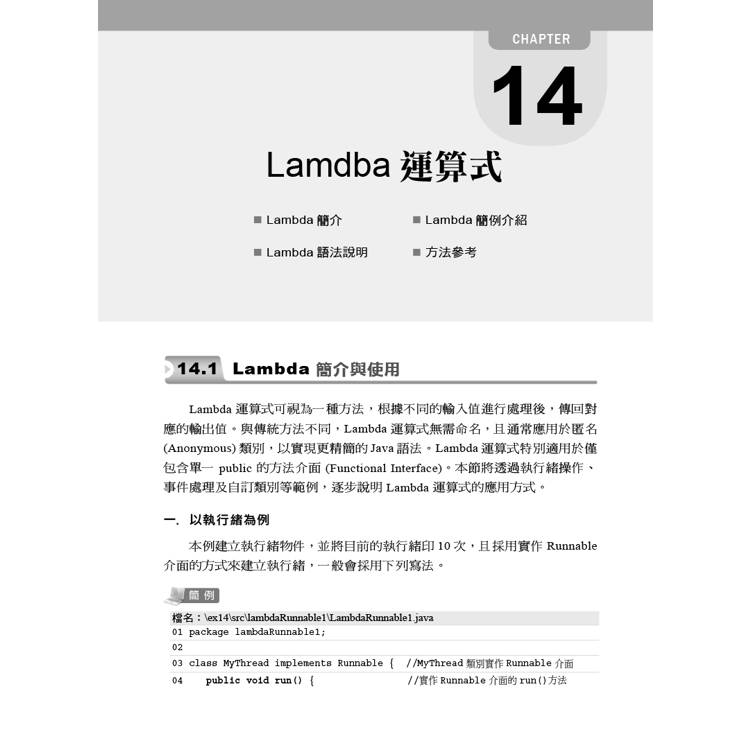 內容由Java程式設計流程控制、陣列、方法、物件導向程式設計、介面與泛型、多執行緒、例外處理、檔案處理、Lambda運算式、Swing視窗應用程式。並附上拉霸遊戲機與記憶大考驗專題電子書供初學者練習。每個單元由淺入深、循序漸進、範例貼近日常生活,讓初學者能學以致用。