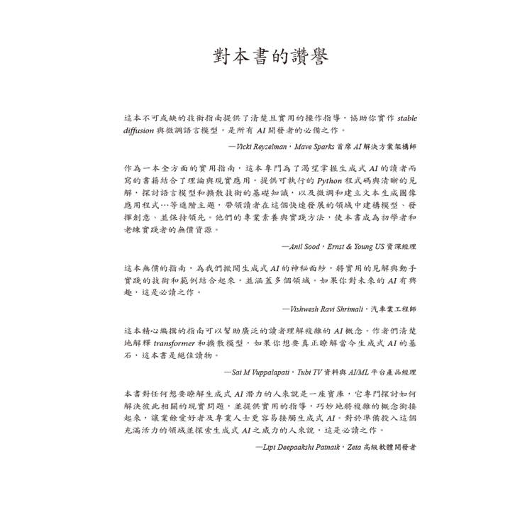 「本書包含學習生成式AI的一切資源,包括全面的解說、深思熟慮的技巧,與DIY練習,可謂應有盡有。」