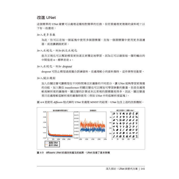 本書還探討了從頭開始訓練和使用大型預訓練模型之間的權衡,如何建立能夠修改圖像風格的模型,以及調整變形模型以達到創意目的。內容涵蓋了文本、圖像和音頻等多種數據類型的生成模型,並詳細講解了Transformer和擴散模型等先進技術的構建和訓練方法。最後介紹了如何訓練一個能夠根據個人風格撰寫文字的模型,以及如何部署模型作為互動展示或服務。