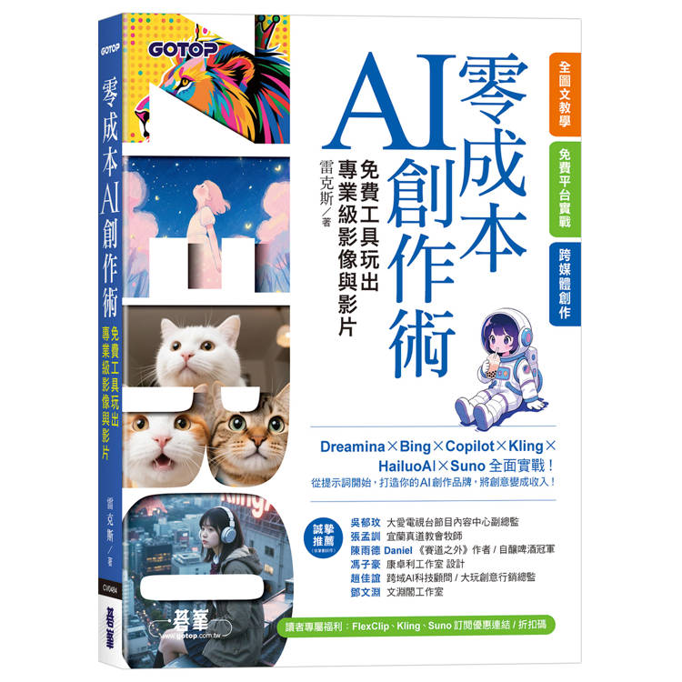 本書透過全圖文解析、免費工具教學、創作策略與實例分享,帶你一次學會AI生圖、AI動畫、AI作曲、專業剪輯等最新技能。不需要昂貴的設備、也不需要設計背景,人人都能快速上手,讓AI成為你的創作夥伴。