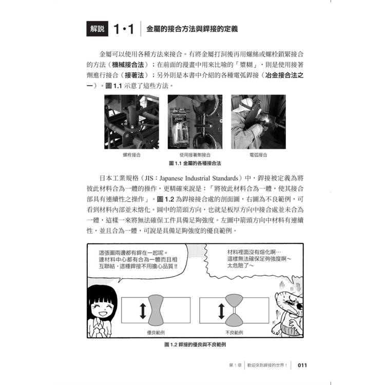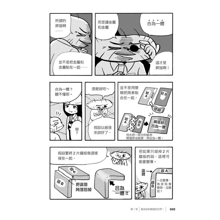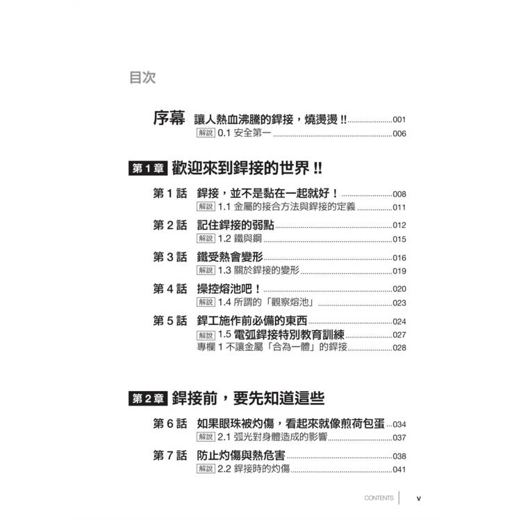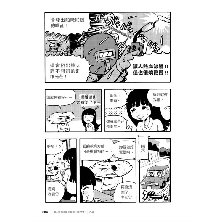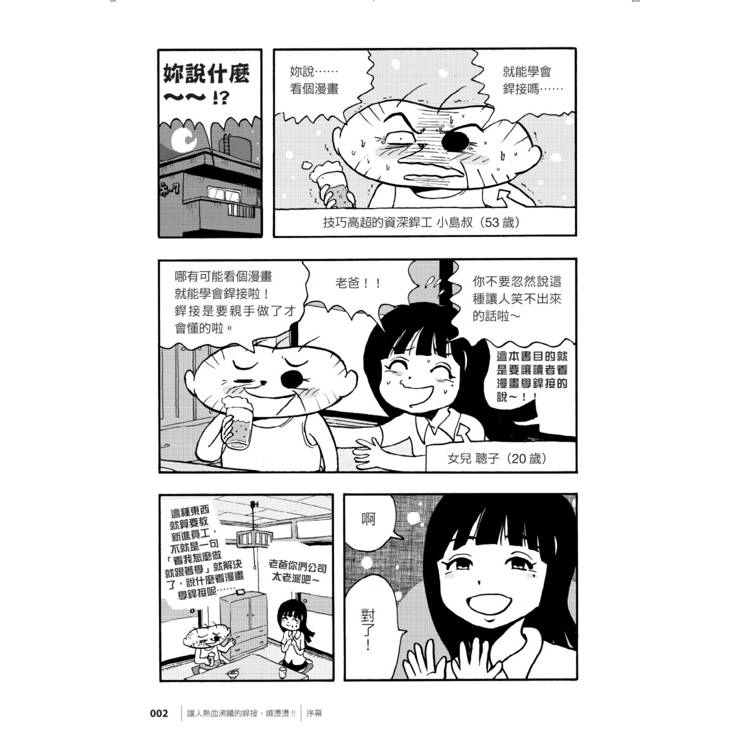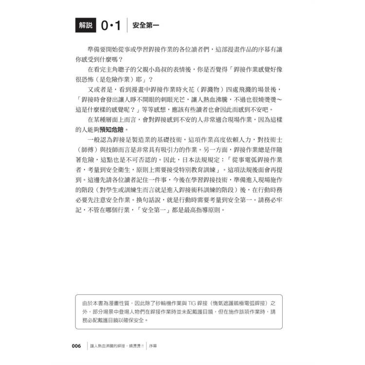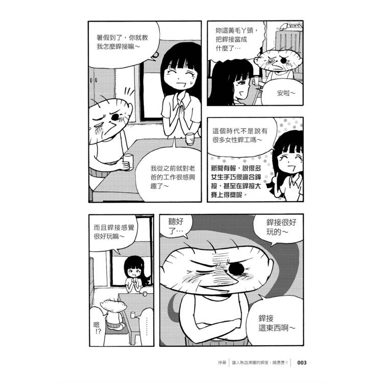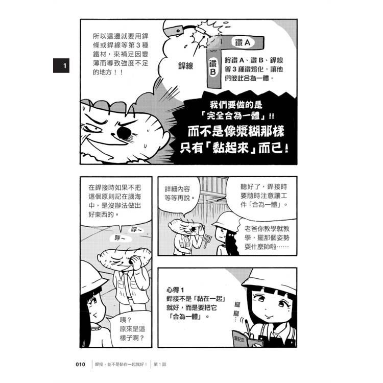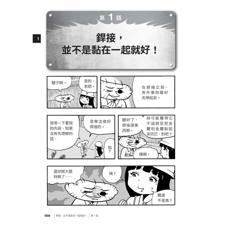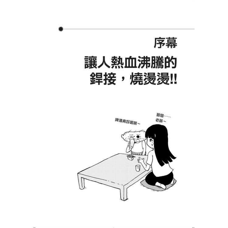本書是為了即將開始學習銲接的讀者而準備的入門書籍。銲接漫畫界大師野村宗弘的暢銷作品「熔融鐵工廠」(講談社)中的超人氣角色們也會在本書登場,以淺顯易懂的方式講解電弧銲接的世界。一般而言,這種透過漫畫形式進行解說的工具書中,漫畫家通常只會依照原作者的想法畫出漫畫而已,但本書並非如此。也就是說,本書漫畫的作者野村宗弘曾接受過日本公共職業訓練學校的專業訓練,並以銲接技術士的身份進入業界。有業界經驗的野村先生以銲接作業員與管理階層的角度構思本書,並以幽默的筆觸,時而夾雜著現實的一面來描繪銲接作業的世界,在漫畫中無法完全呈現的部分,則由筆者以解說或專欄的方式補充說明。